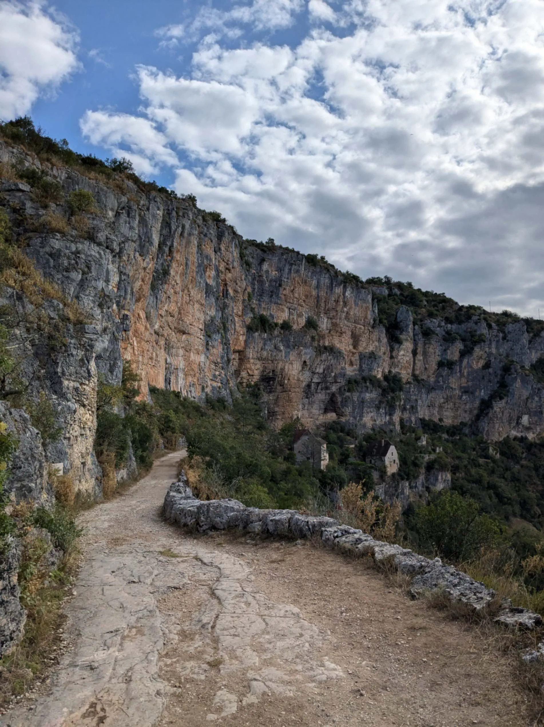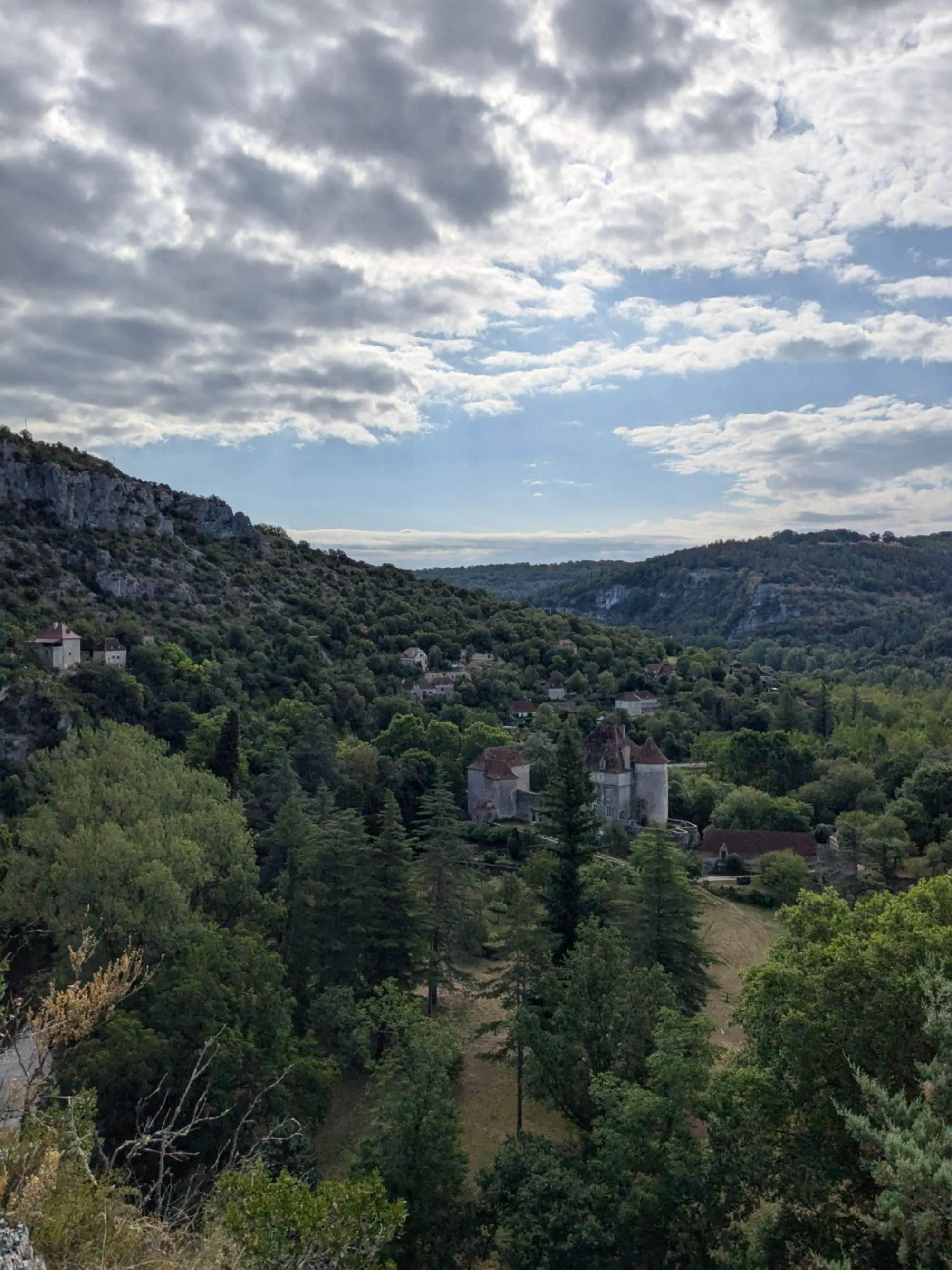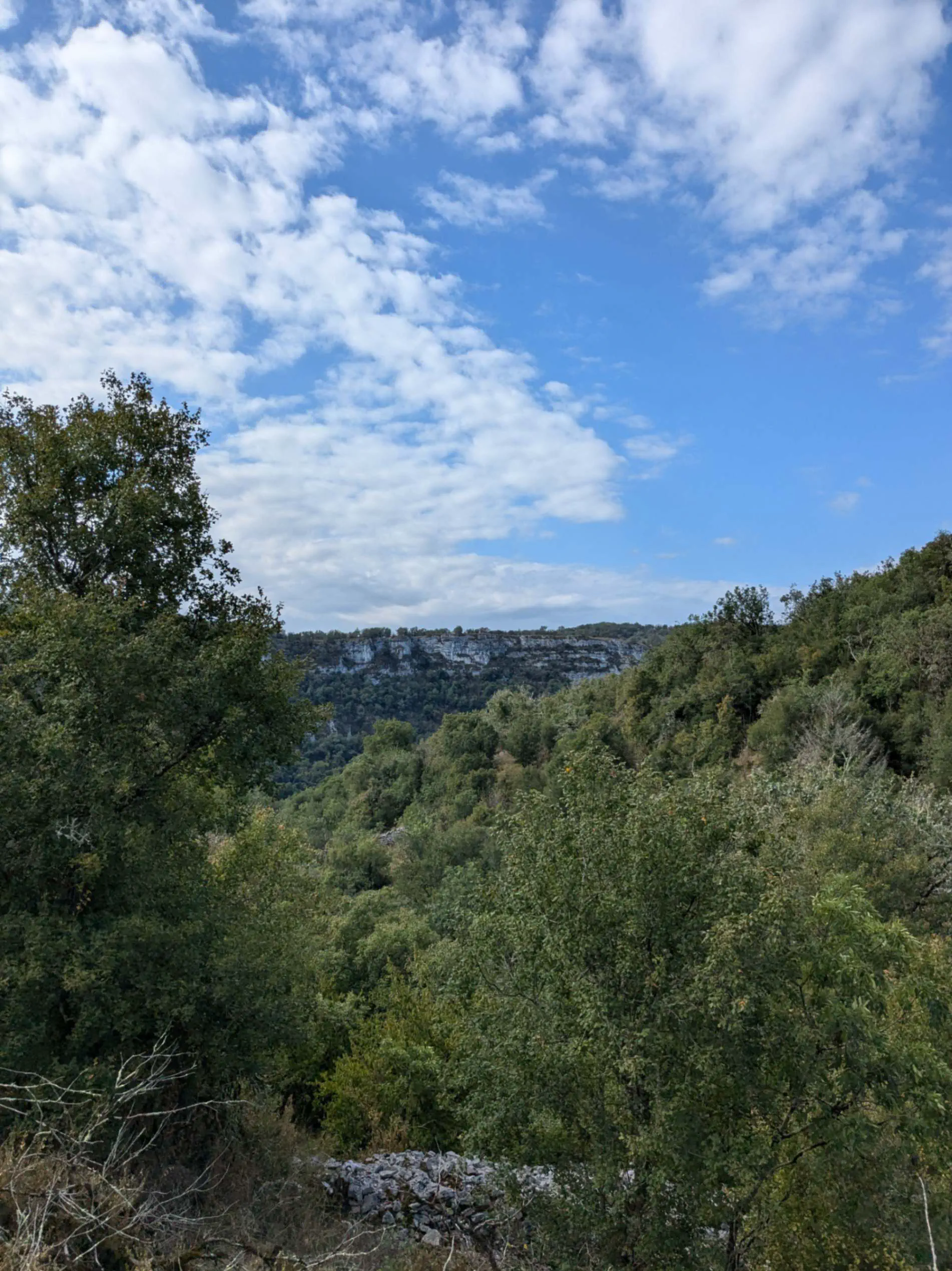 Départ relativement matinal, à 8h, après un petit déjeuner copieux, composé de sandwichs à la banane et au beurre de cacahuète. Ça monte dans les premiers kilomètres car il faut gravir le causse, mais l’ascension est brève et nous redescendons rapidement sur Sauliac où nous pouvons faire une petite pause et nous réapprovisionner en eau. La vraie difficulté de la journée a surtout lieu juste après…