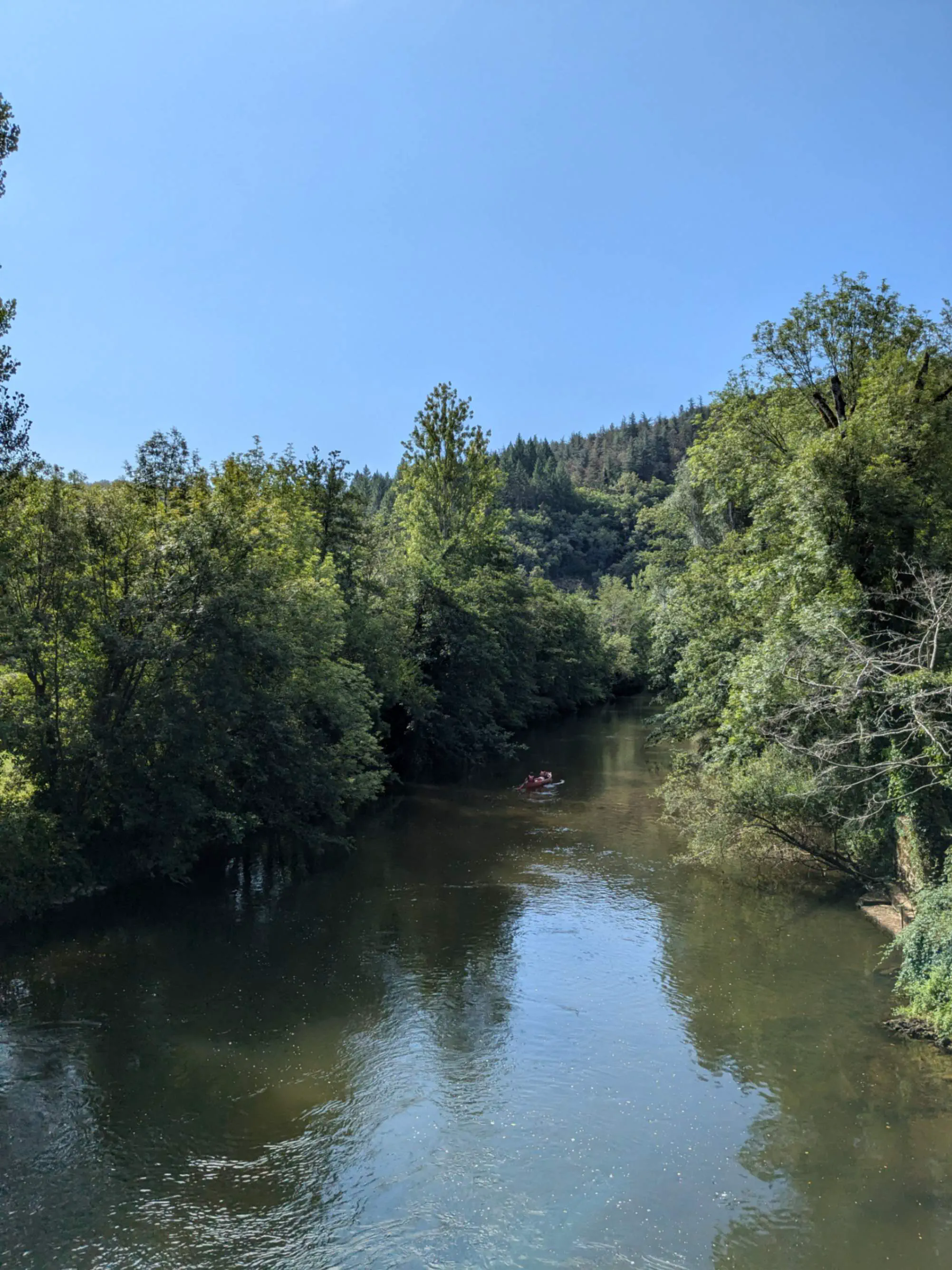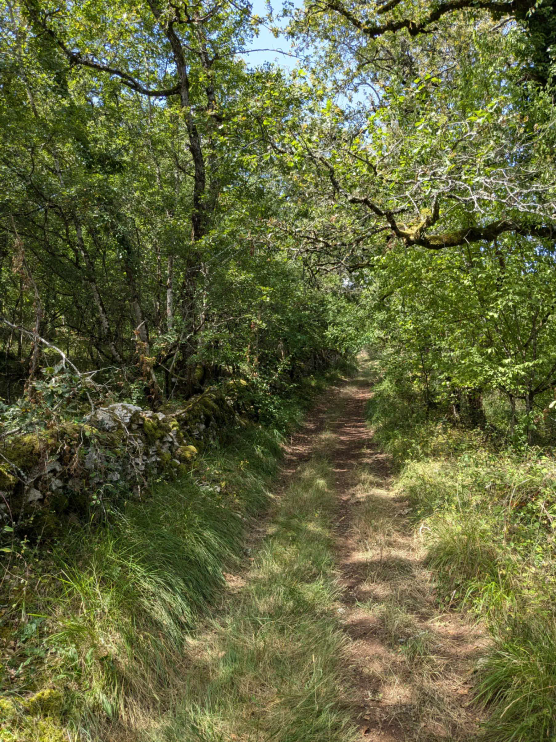 Une fois le Célé franchi grâce à un joli pont de pierre, nous nous armons de courage pour partir à l’assaut du causse qui nous sépare de Saint-Cirq-Lapopie. Cette fois c’est plus long, d’autant que la température a sérieusement grimpé. Après les sous-bois, c’est un plateau herbeux et brûlé qui nous accueille. Une petite installation en bois nous permet de manger à l’ombre en profitant - ou subissant, c’est selon - le chant des cigales. La redescente est vite avalée, bien que le soleil pèse désormais de tout son poids sur nos crânes dégoulinants.