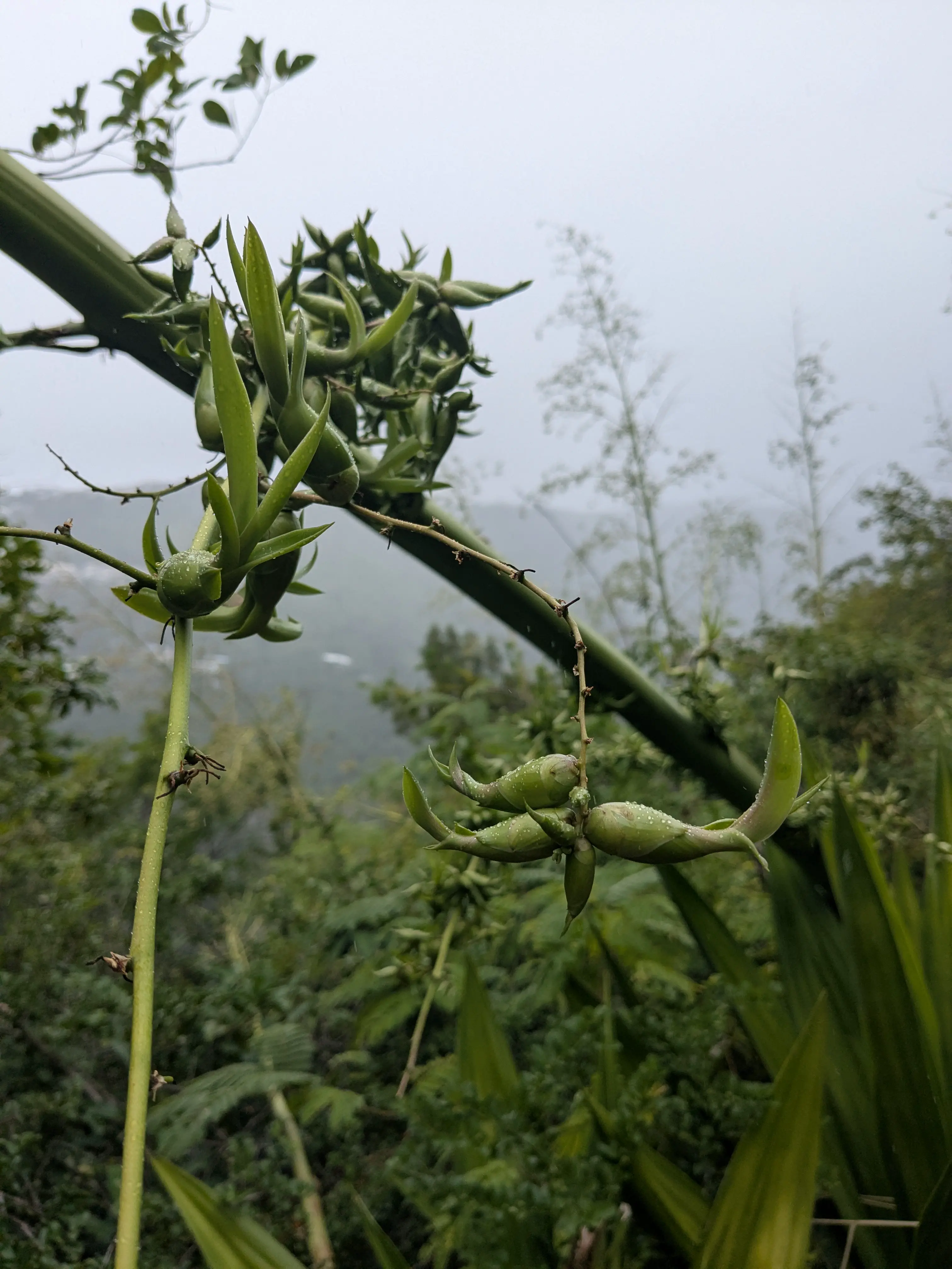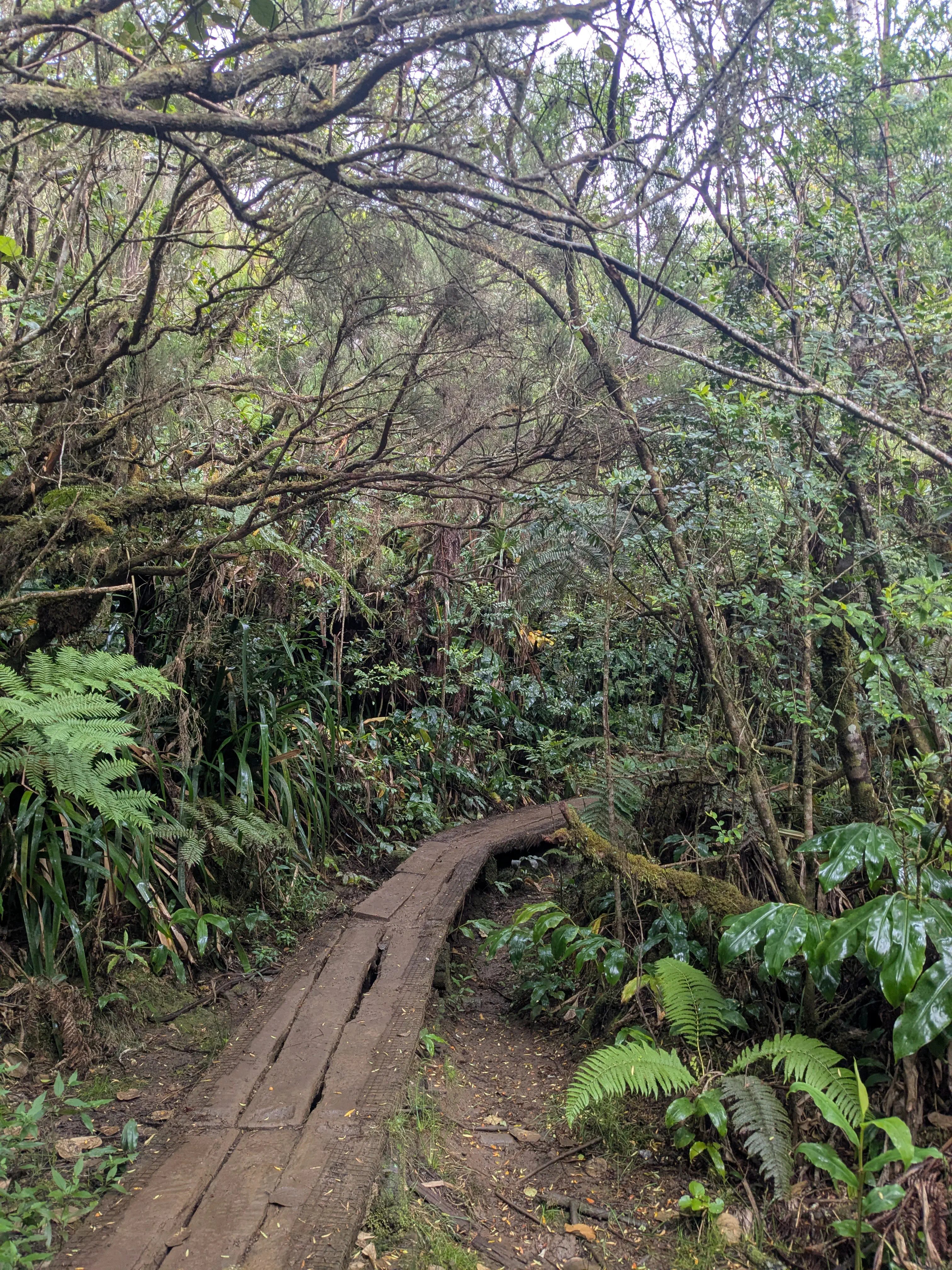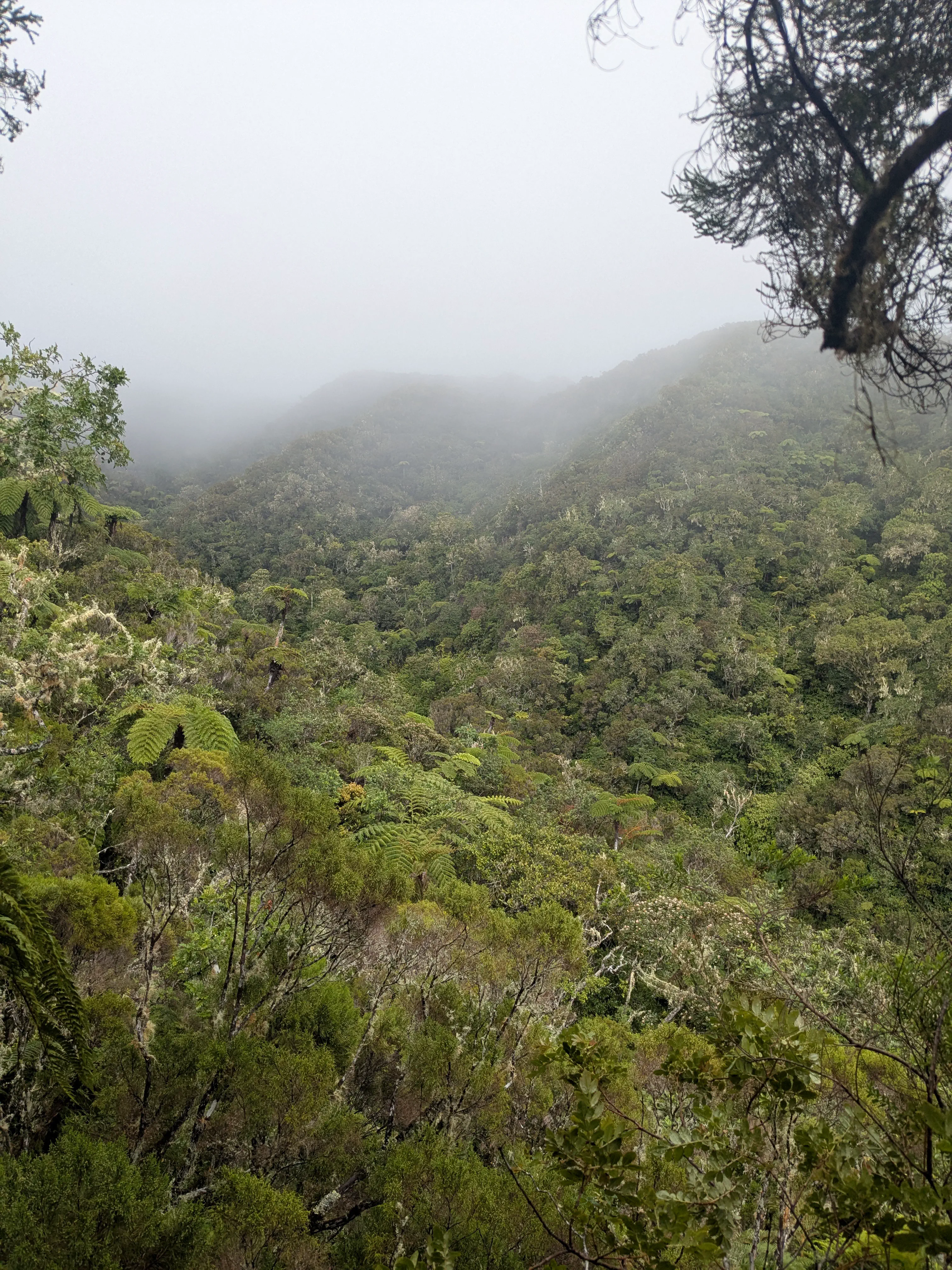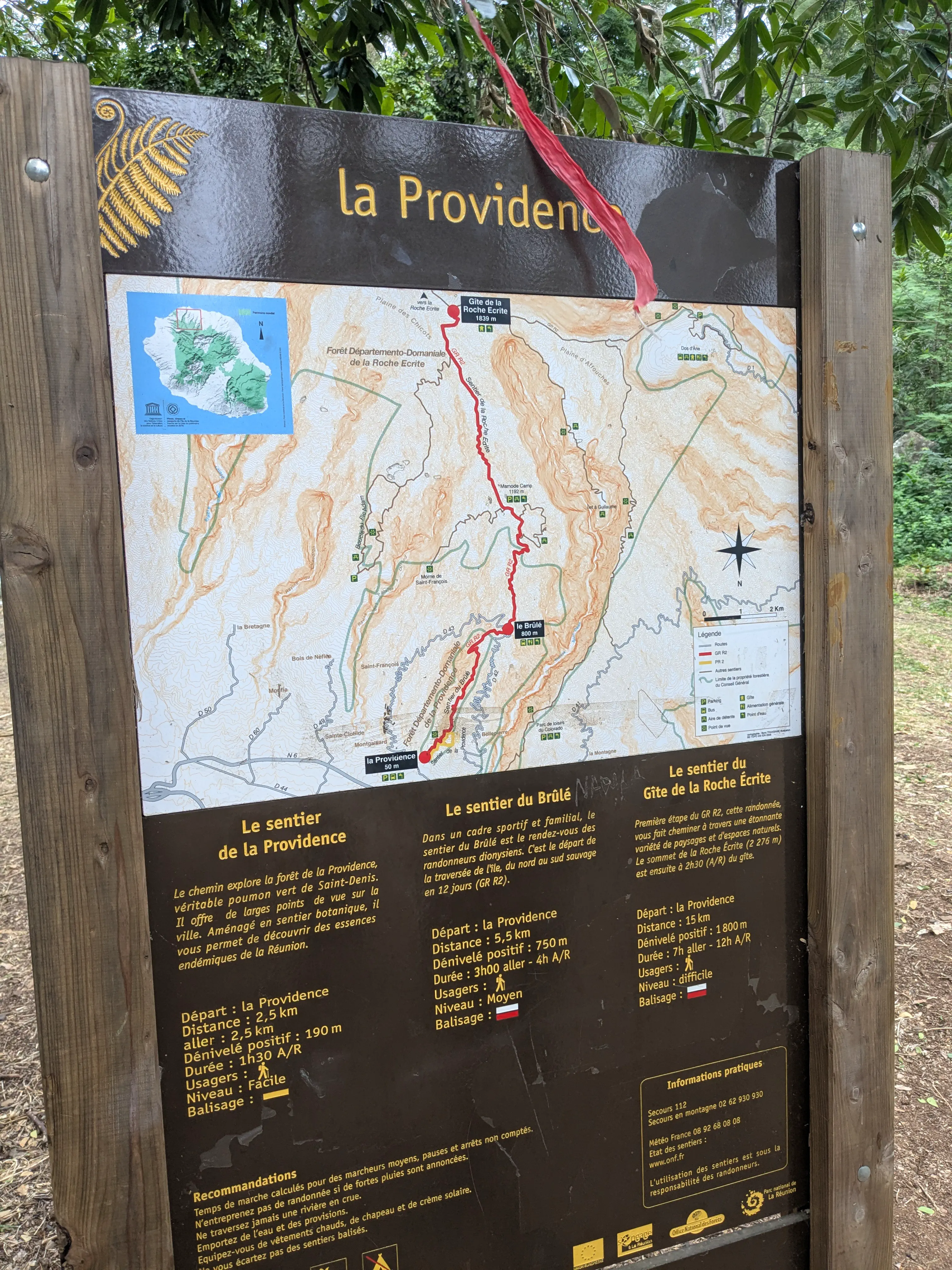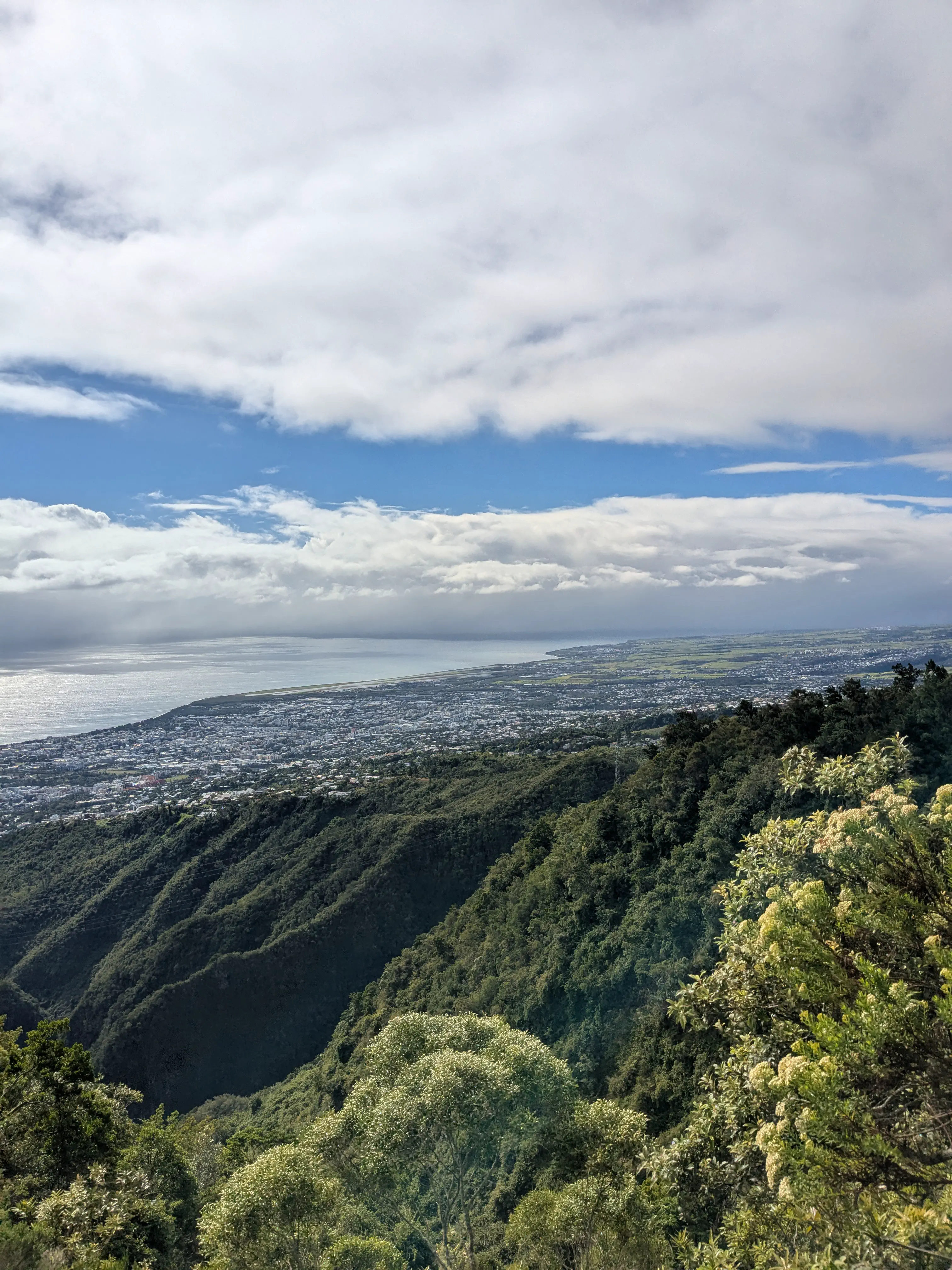 Vers 8h, le départ officiel de cette aventure est donné. D’abord une longue traversée de Saint-Denis, avant d’attaquer le véritable sentier. Dans cette immense ascension, nous ne sommes pas aidés par la météo. Il fait chaud, humide, et il pleut régulièrement. La vue est malheureusement souvent bouchée, mais nous nous régalons des plantes et oiseaux exotiques.