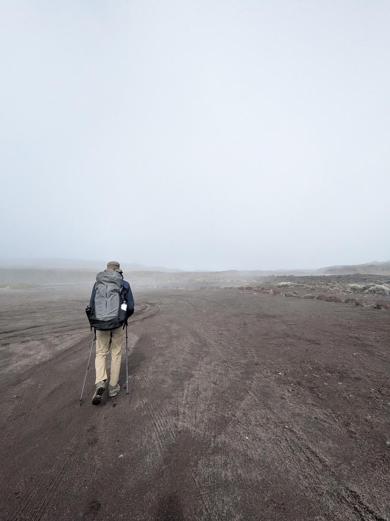 L’objectif du jour est de gravir le volcan, puis de retourner dormir un peu plus loin autour du cratère. L’ascension est longue mais aisée, si l’on oublie la cohorte de touristes et le ballet des hélicoptères qui survolent le cratère. La traversée du champ de lave est magnifique, le sol, lunaire (on dirait la croûte craquelée d’un gros brownie). En deux heures, nous sommes en haut.