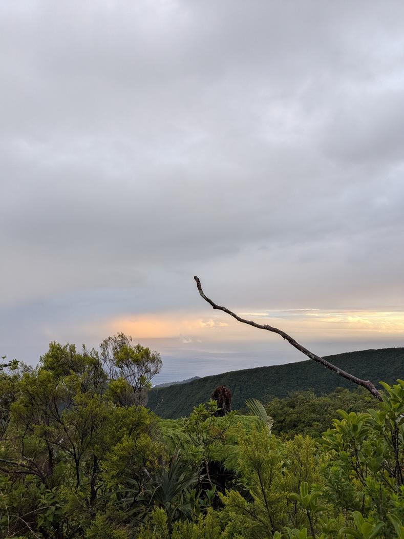 Aucun emplacement ne nous permet de nous arrêter pour poser la tente. Nous comprenons donc assez vite que nous devrons aller jusqu’au bout. Des scories l’on passe à de la terre grasse, des arbustes maigrichons aux fougères tropicales. Les pierres et racines glissent, pas un instant d’inattention. Soulagement lorsque l’on aperçoit la mer, malheureusement le soleil se couche.