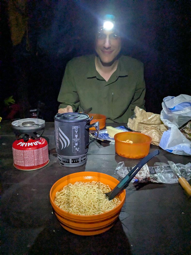 À la frontale, nous finissons les 200 mètres de dénivelé qu’il nous reste jusqu’à un kiosque où nous avions prévu de dormir. Épuisés, nous arrivons. L’air est chaud, le kiosque bien au sec, c’est un petit plaisir simple. On mange le dernier saucisson, des cacahuètes et des nouilles chaudes. Demain il ne nous reste que huit kilomètres, un peu de bus, puis nous retrouverons nos amis. Un peu de confort, enfin !