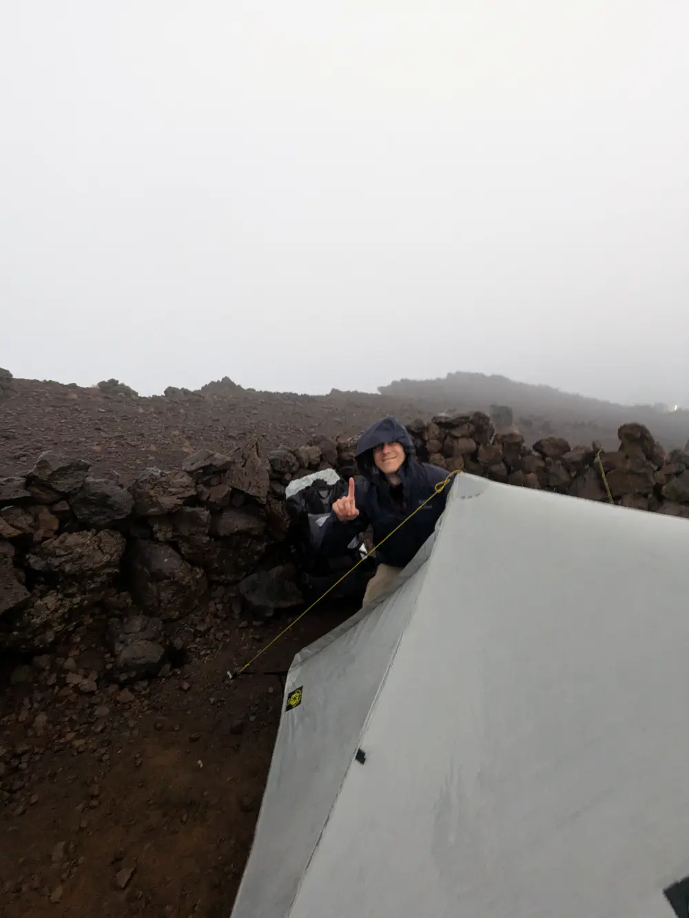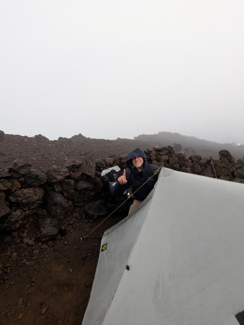 Finalement, la chance n’aura pas été de notre côté. Ce matin au réveil, nous sommes accueillis par des nuages, de la pluie, du vent, ceux-là mêmes qui avaient ballotté notre pauvre petite tente toute la nuit durant. Point de lever de soleil donc, déception pour les innombrables marcheurs qui étaient venus l’admirer.