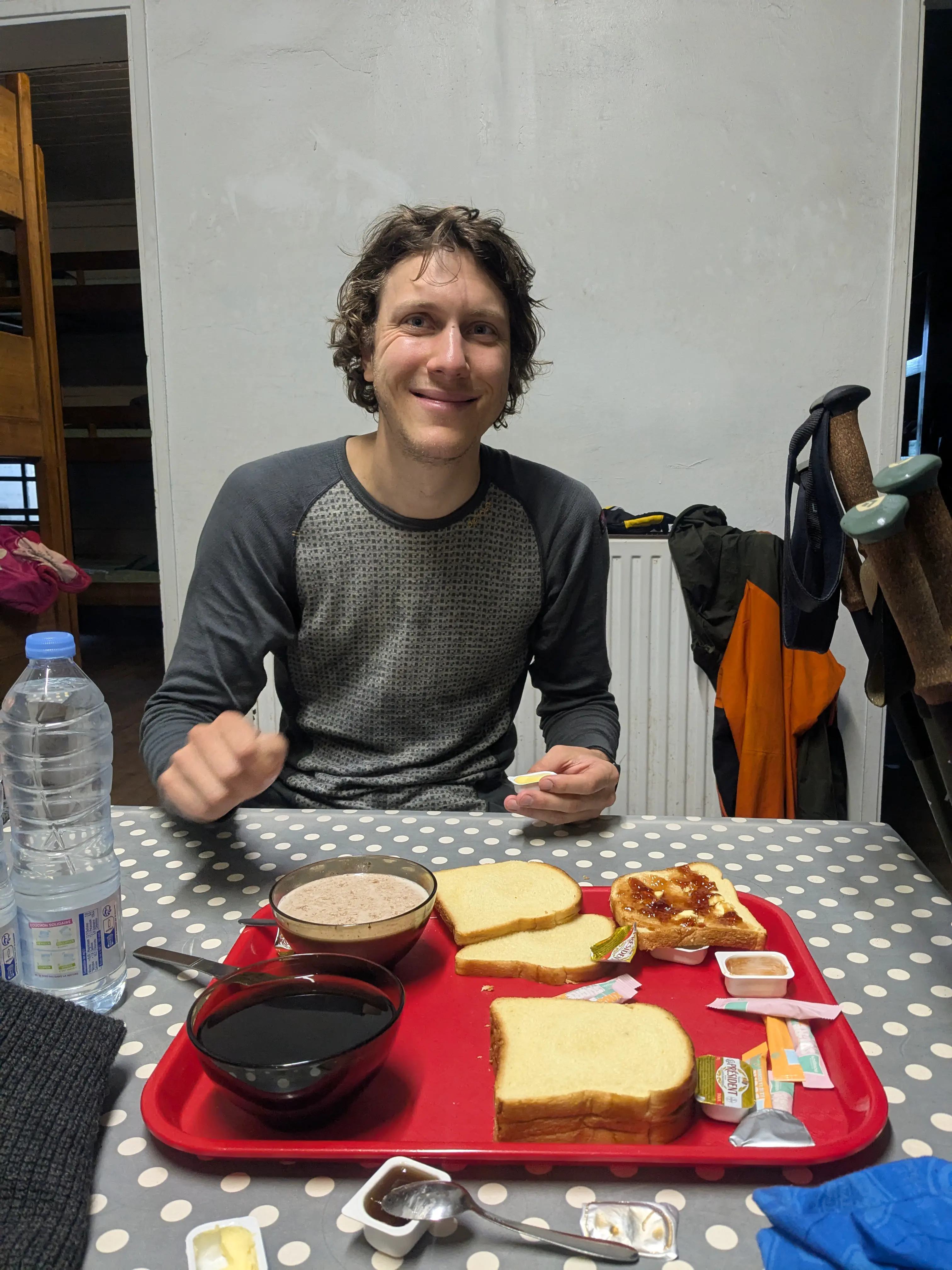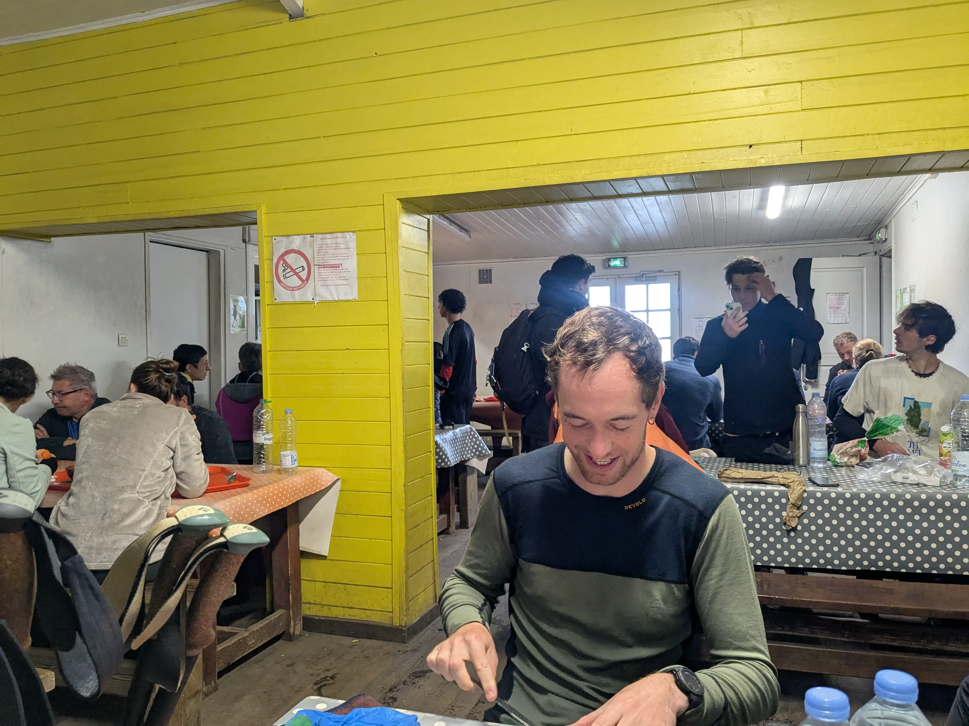 Nous plions rapidement nos bagages, beaucoup de choses sont mouillées, la tente a un peu pris l’eau. La redescente s’effectue en quatrième vitesse vers le gîte, où nous espérons pouvoir petit-déjeuner. On rencontre de nombreux touristes, enveloppés de couvertures de survie, qui ne semblaient guère préparés à affronter les conditions climatiques. Au gîte, on nous sert de grands cafés et chocolats chauds, assortis de tranches de brioche ; enfin un peu de réconfort.