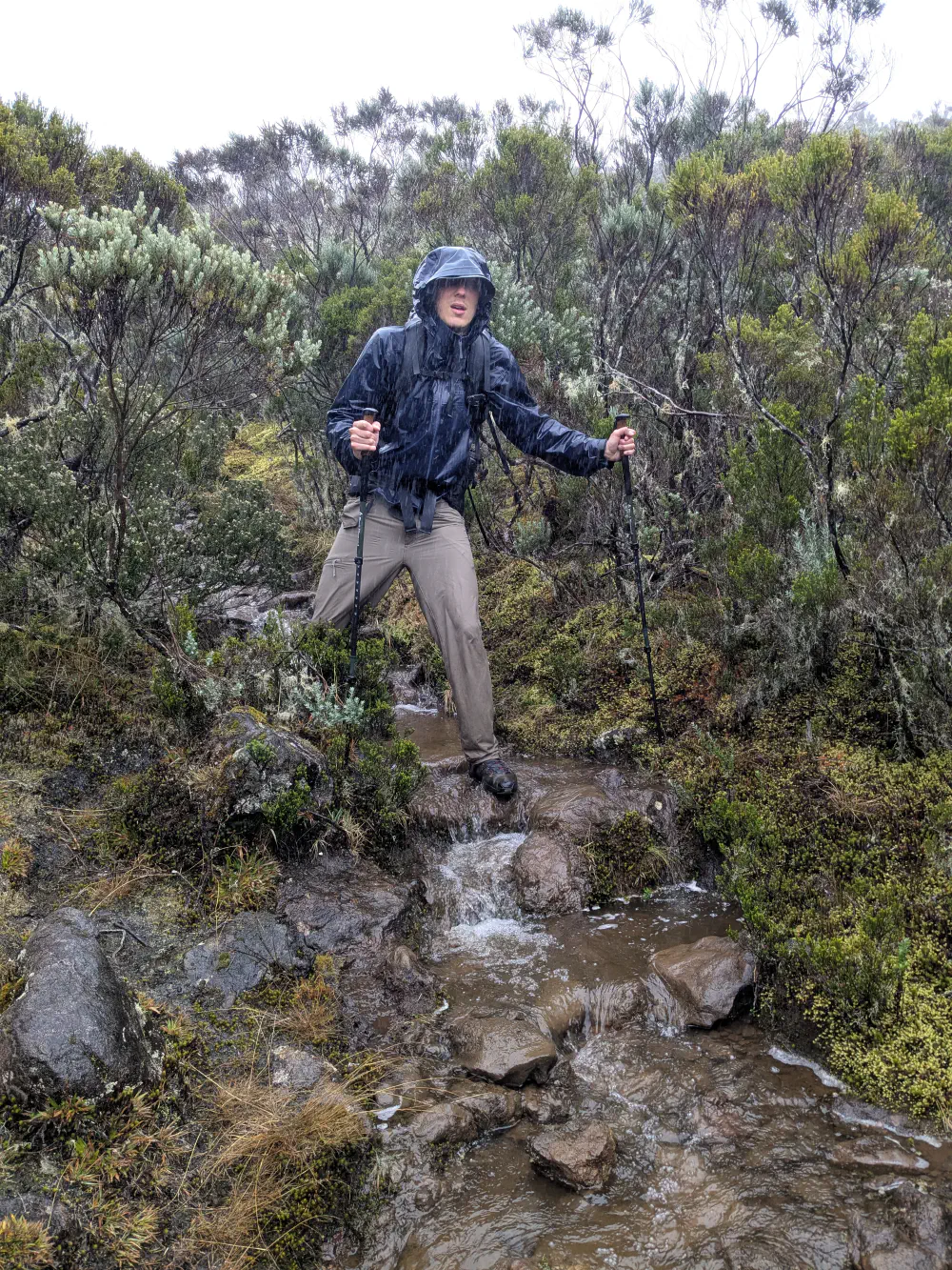 Le plaisir est de courte durée, car il faut se rendre à l’évidence : la pluie ne nous quittera plus aujourd’hui. Commence alors une interminable descente vers la plaine des Cafres, le long d’une crête qui semble magnifique, mais dont nous ne verrons rien. Des heures de souffrances, le chemin est une rivière, nous serrons les dents.