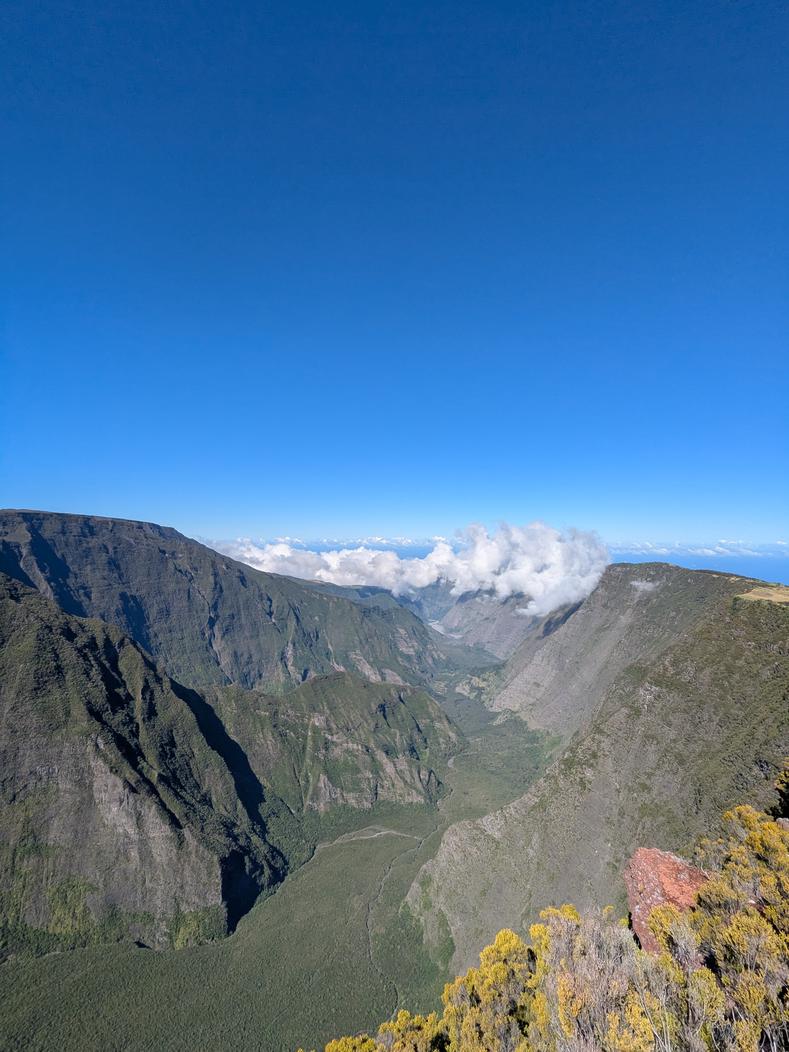 La montée du Nez de Bœuf est l’occasion d’apercevoir la muraille entourant le Piton de la Fournaise pour la première fois, ainsi qu’une profonde vallée verdoyante.