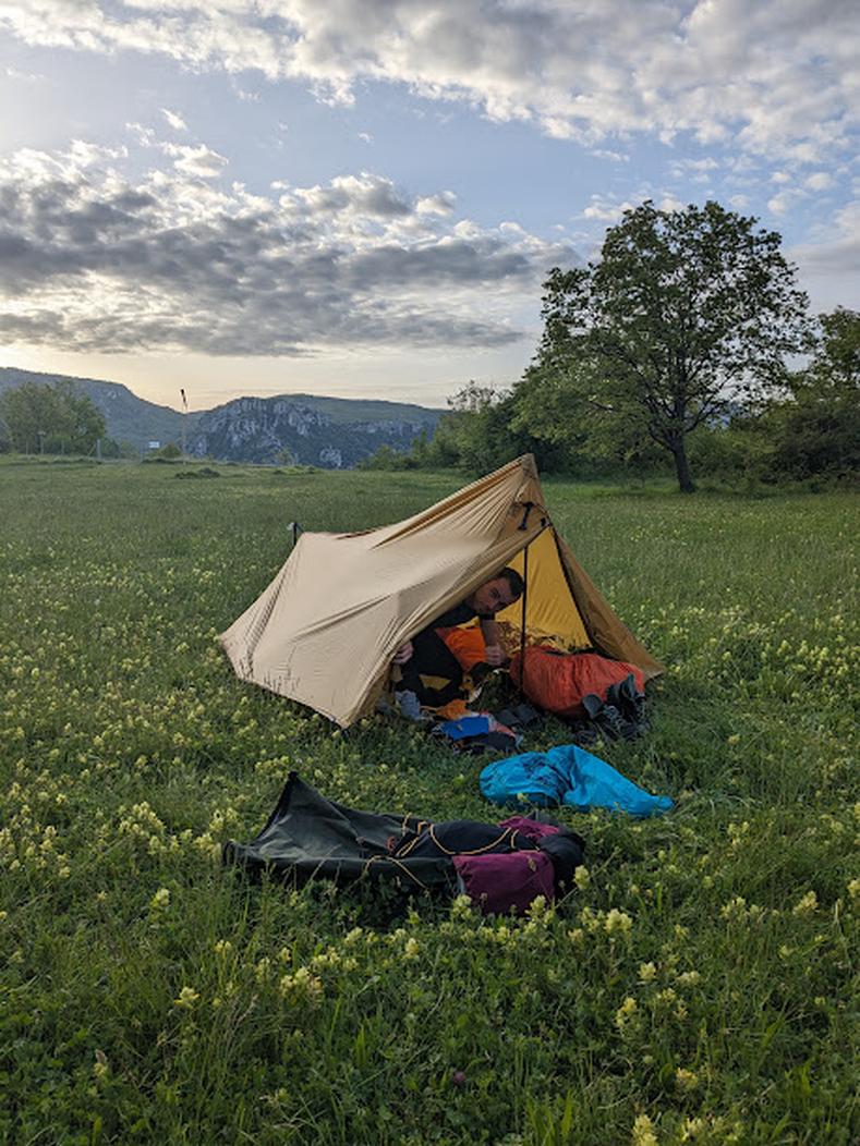 Nous testons ma nouvelle tente tout juste sortie de “l’atelier”. Je n’ai qu’une peur : qu’elle ne résiste pas à la pluie annoncée !