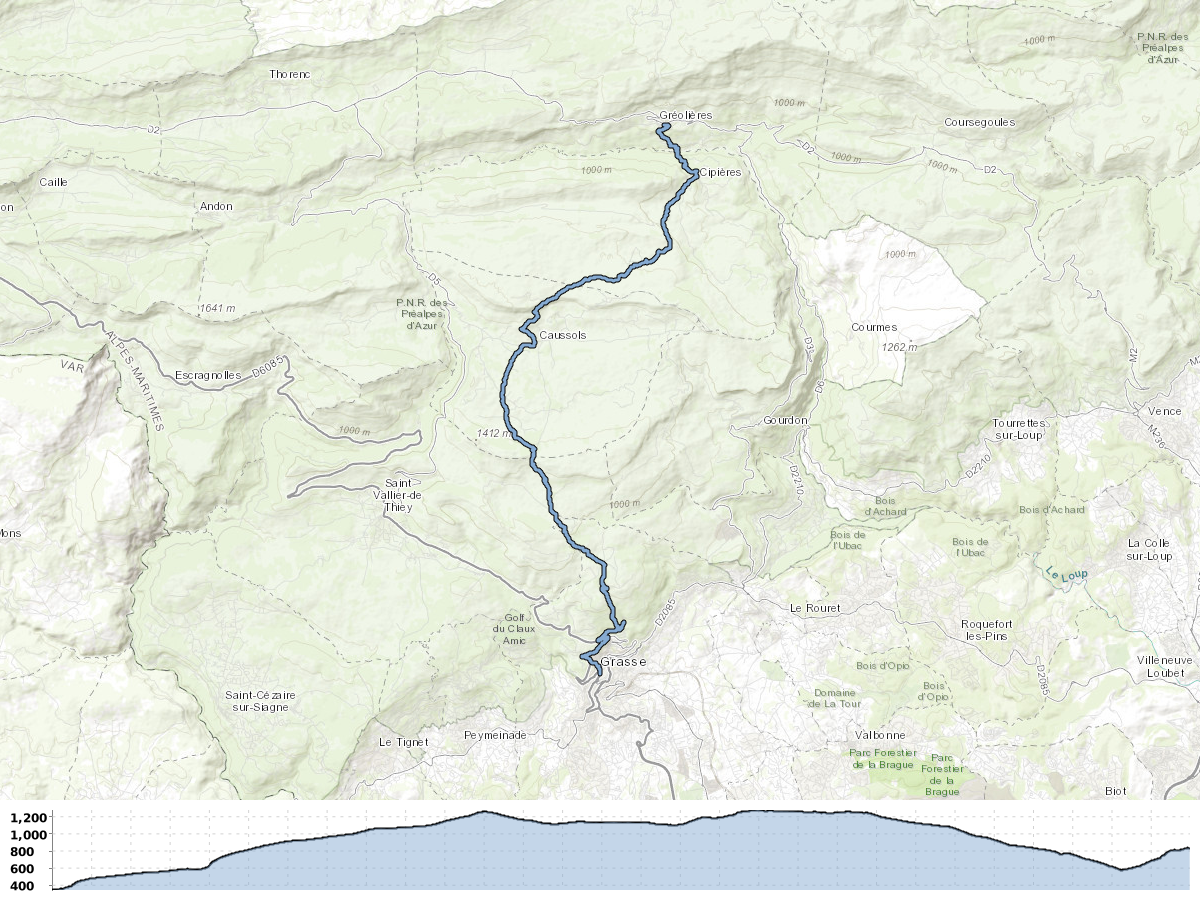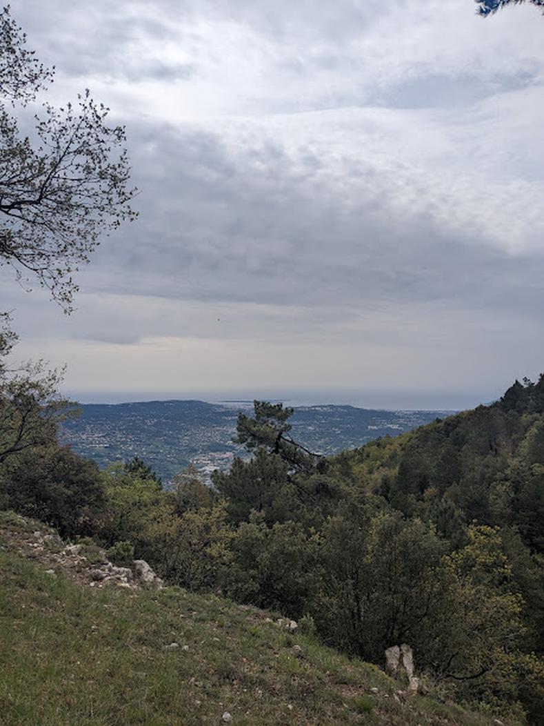 Nous partons de bon matin de Grasse où nous nous sommes retrouvés la veille dans un petit airbnb à peine assez large pour contenir nos grandes carcasses. Le temps est maussade sans être désagréable, bien que nous aimerions profiter de la vue sur mer, au lieu de subir un brouillard épais et persistant. Ce n’est qu’après un bon effort, sur les hauteurs de la ville, que l’azur se découvre.