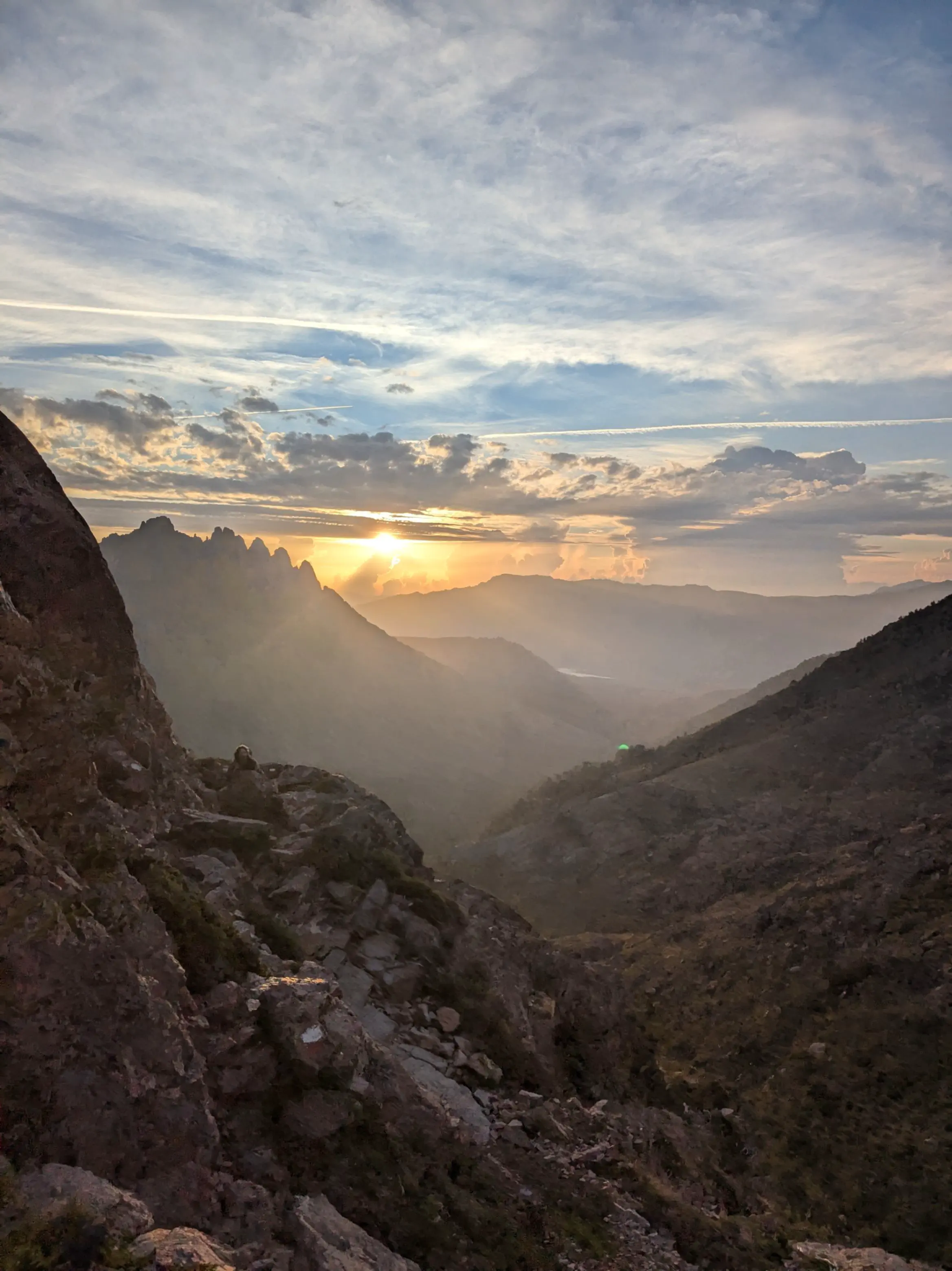 Une grosse montée nous attend ce matin, avec escalade en prime. Heureusement, je me suis bien endurcit ces derniers jours et ces passages ne sont plus un problème. Nous atteignons le sommet sous le soleil levant. S’ensuit une immense descente à travers les blocs de pierre et les pins.