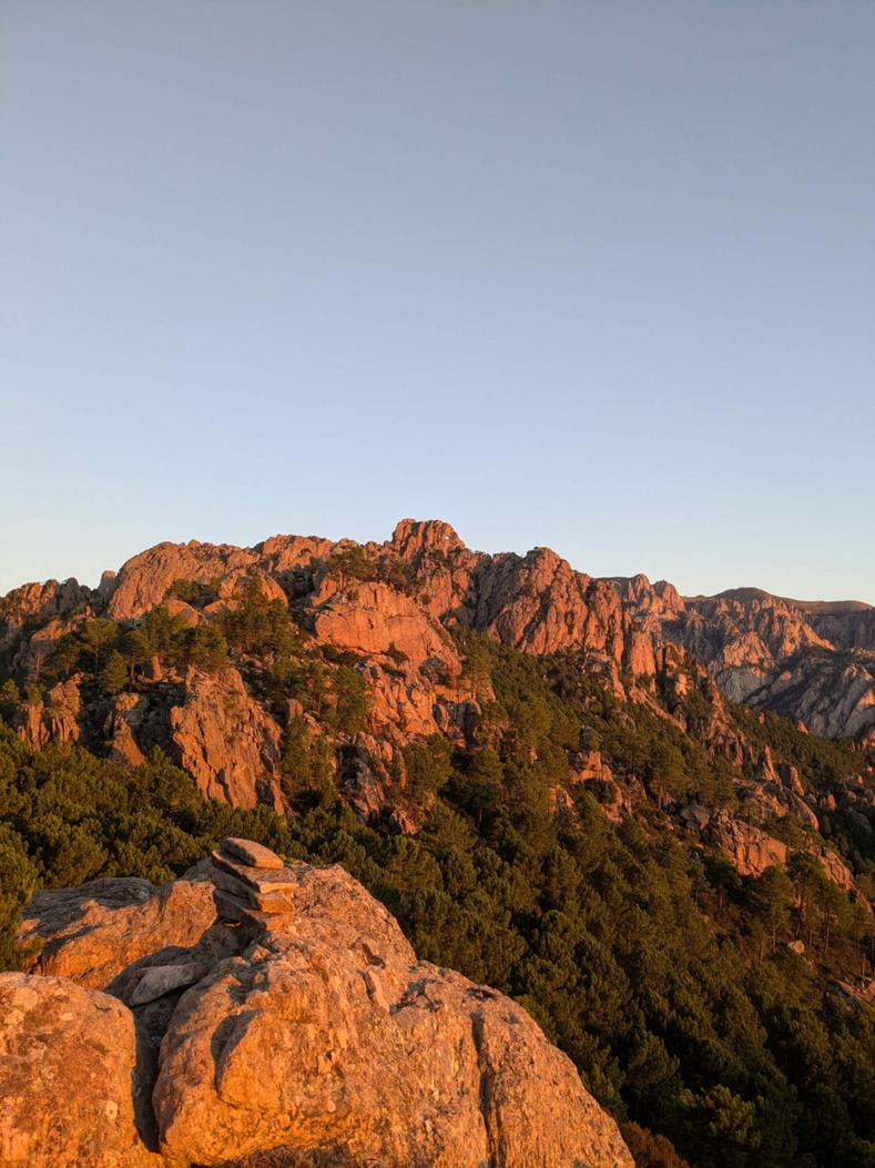 Drôle d’ambiance ce matin au refuge. Nous sommes nombreux à terminer l’aventure GR20 aujourd’hui et il flotte à l’aire de bivouac une atmosphère décontractée et sereine. D’autant que la journée s’annonce belle. Le soleil se lève paresseusement sur l’île de Montecristo, au nord-est de la Corse et nous nous offrons le luxe de quelques minutes de silence devant la multitude de variations orangées que prend le ciel.