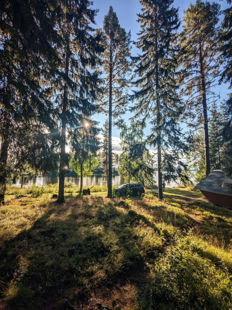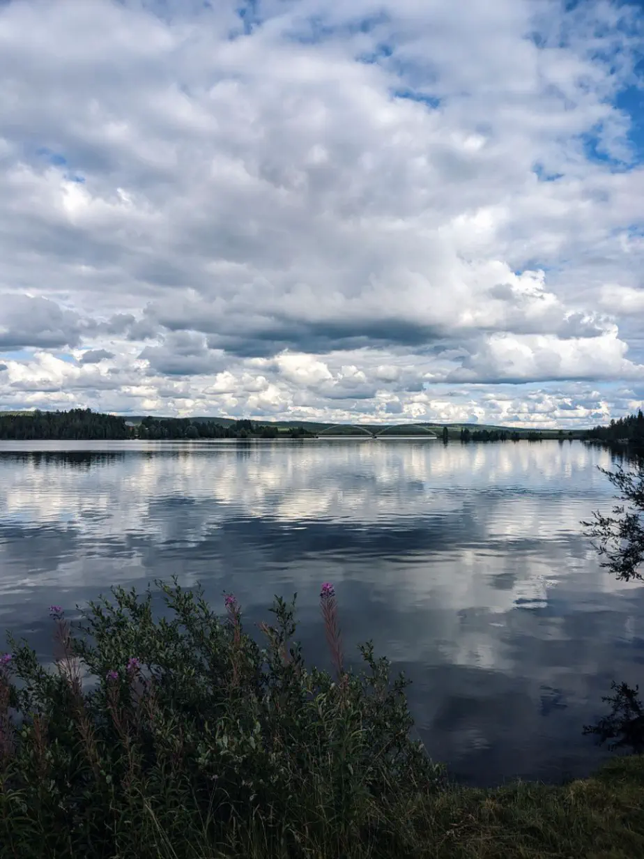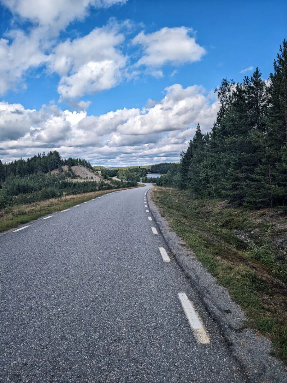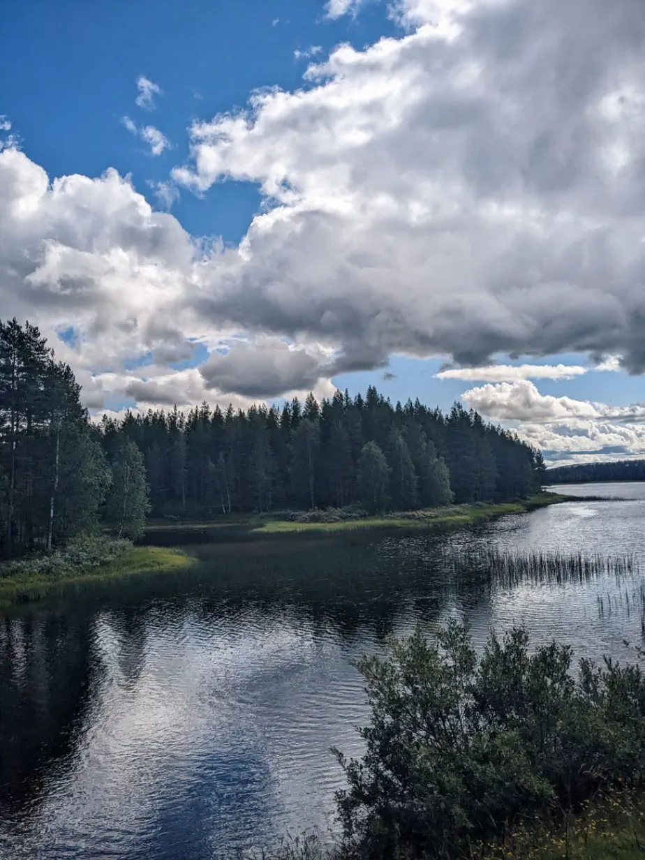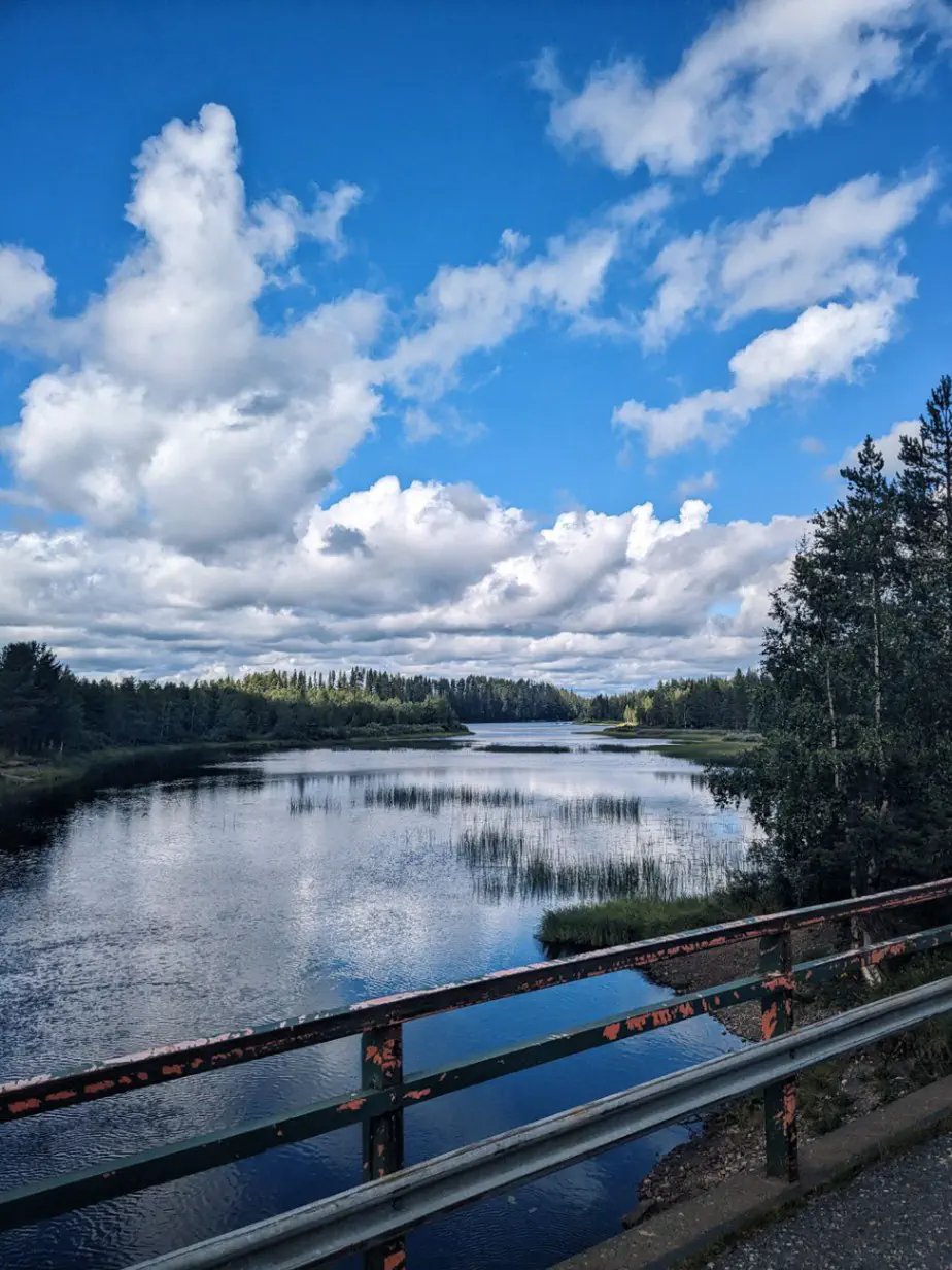 Aujourd’hui c’est enfin sous un grand soleil que nous partons à la conquête de la Laponie. Rapidement nous retrouvons Eduard, un Hollandais que nous avons souvent croisé sur la route. Nous décidons de rouler ensemble, car il vise la même ville que nous, puis de partager un gîte.
