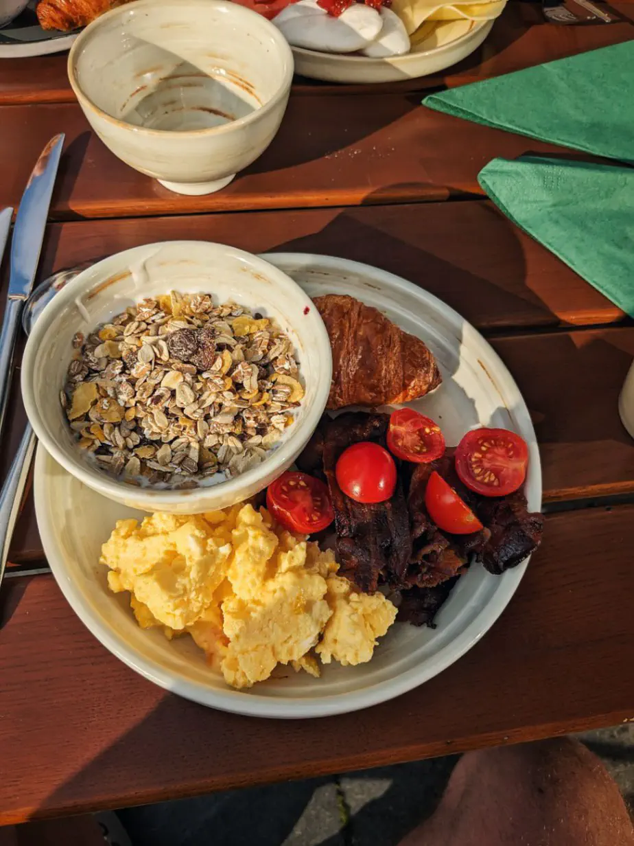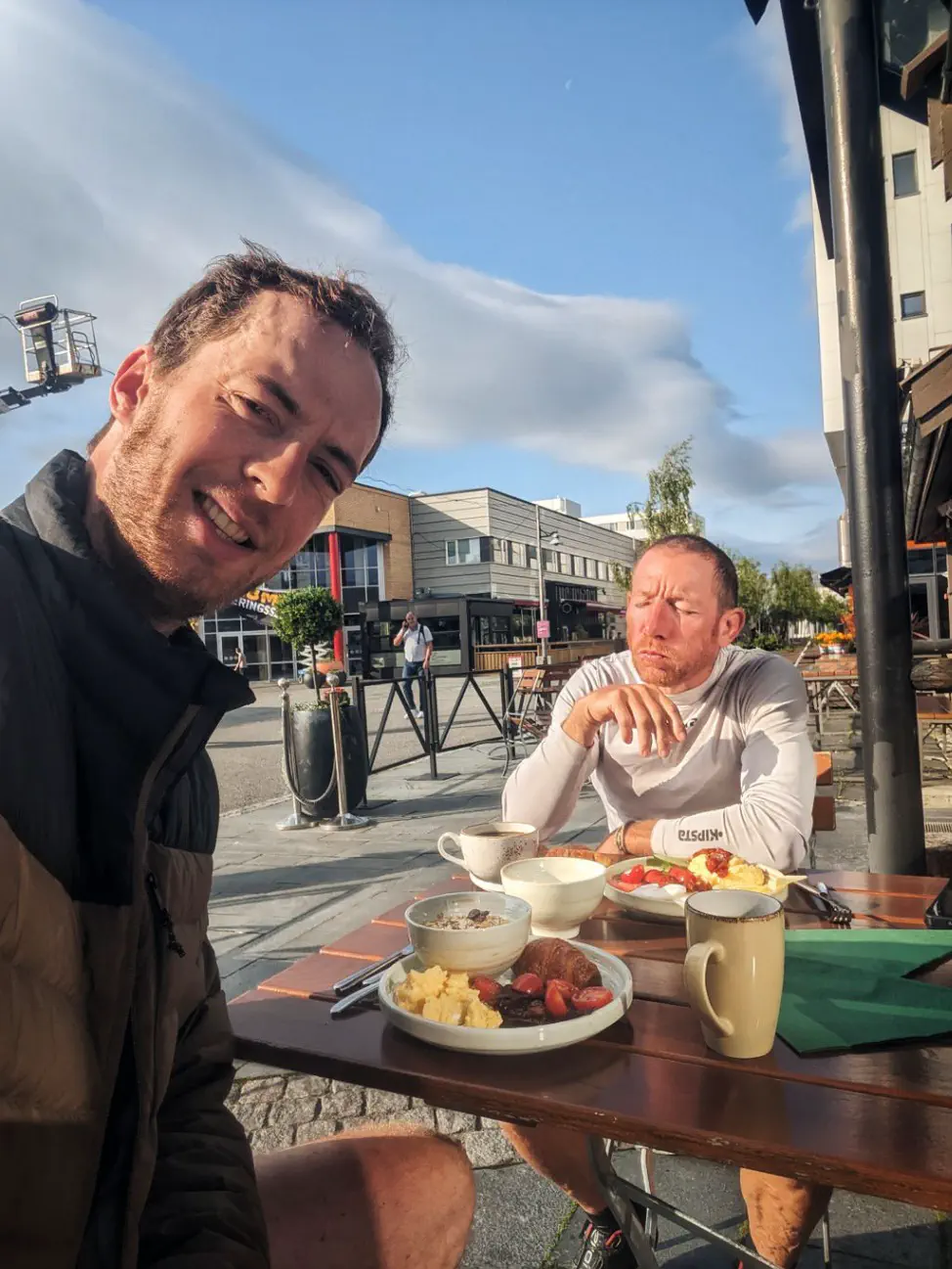Le petit-déjeuner de ce matin se prend en terrasse, au restaurant de l’hôtel. Eduard est parti très tôt pour attraper son vol. Nous profitons donc avec Sébastien du soleil inattendu et du buffet à volonté.