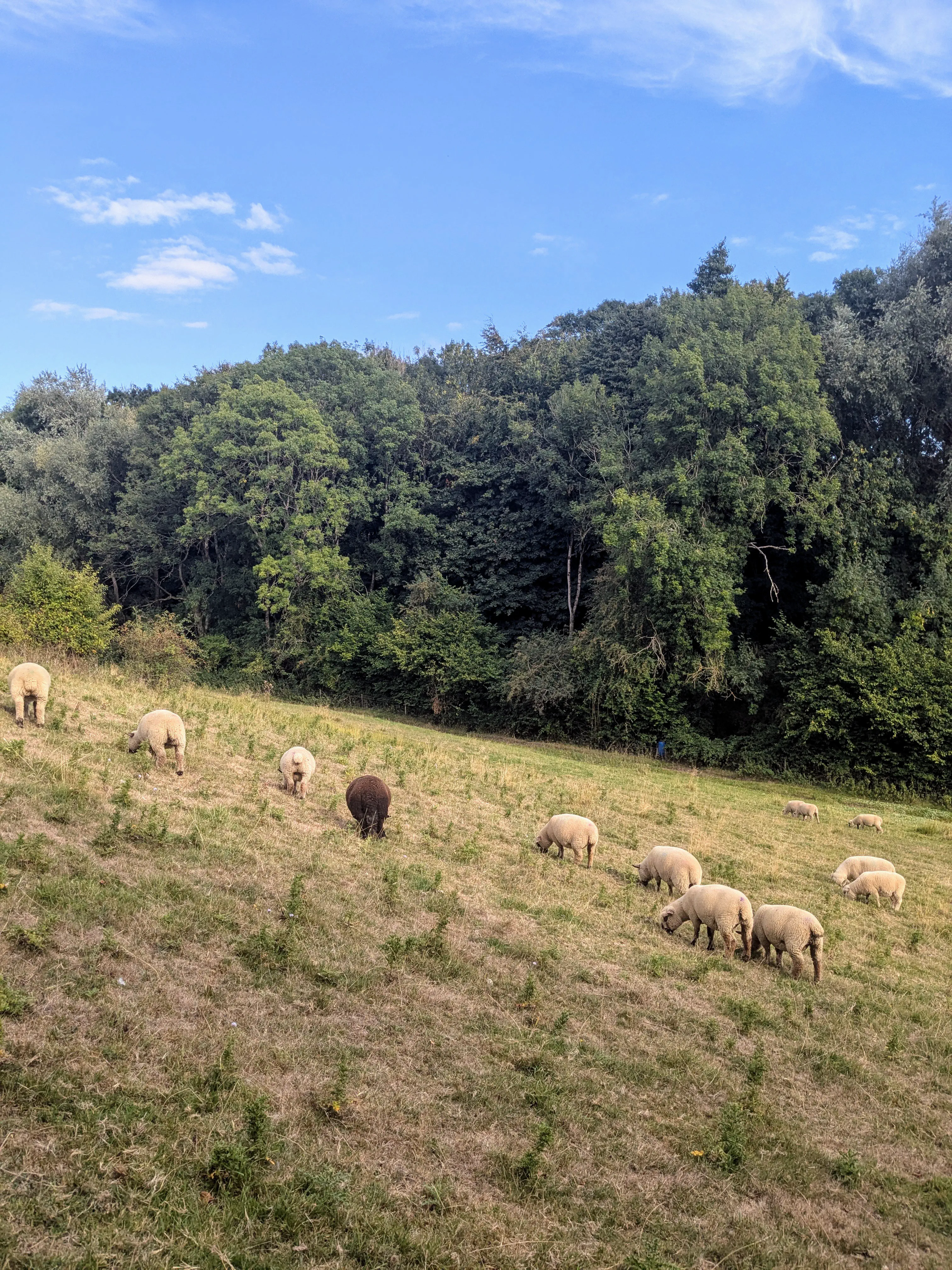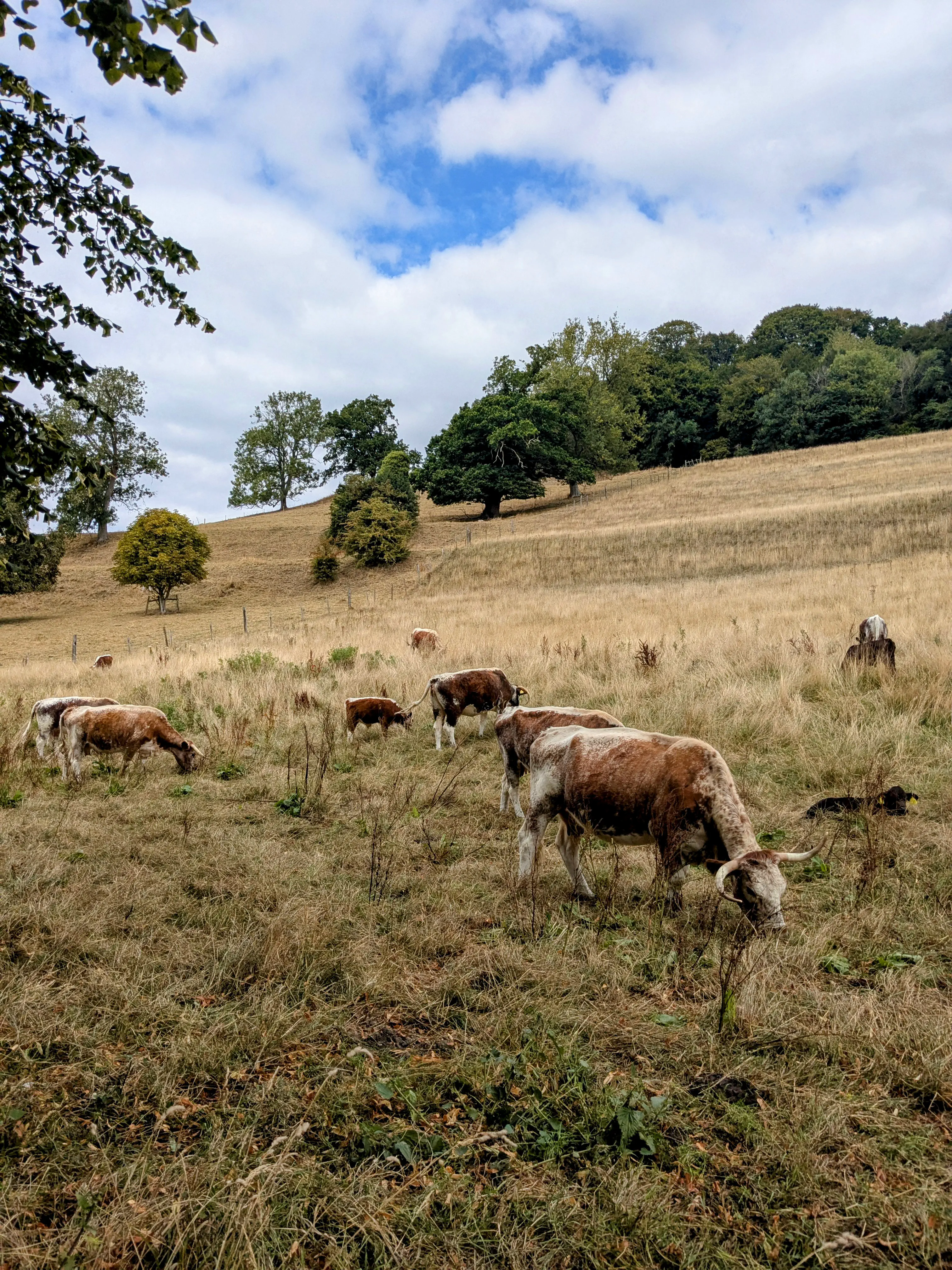 La suite, on commence à la connaître : des champs, des petits bois, des pâturages, des cottages en pierre du pays. Malgré tout, on se lasse pas de contempler les majestueux bovins et les frisés ovins.
