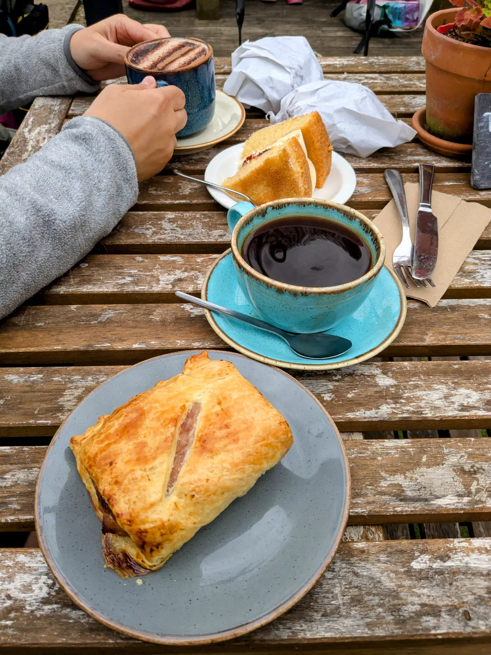 Nous sommes étonnés de découvrir une petite ville de campagne fort dynamique et notamment une rue commerçante animée, flanquée de nombreux coffee shop. Nous en choisissons un, charmant, et prenons notre pause (pour moi un grand café filtre et un sausage roll).