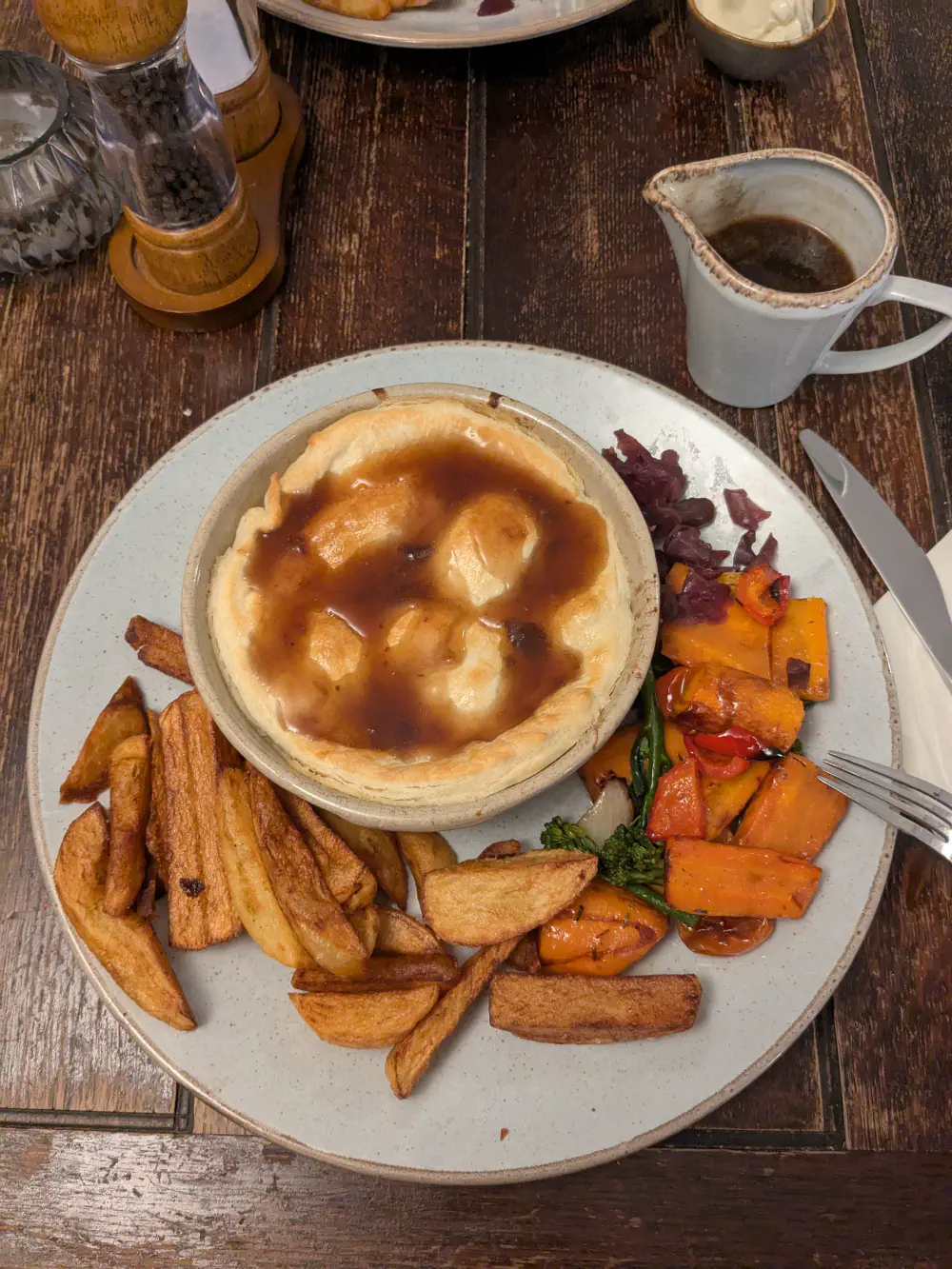 Nous sommes effectivement reçu comme des rois dans cette auberge basse, aux poutres apparentes, qui fleure bon l’Ale fraîchement brassée. Une bonne douche et une rapide visite du village plus tard et nous voilà attablés, prêts à déguster la traditionnelle pie, ici au bœuf mariné à la bière.