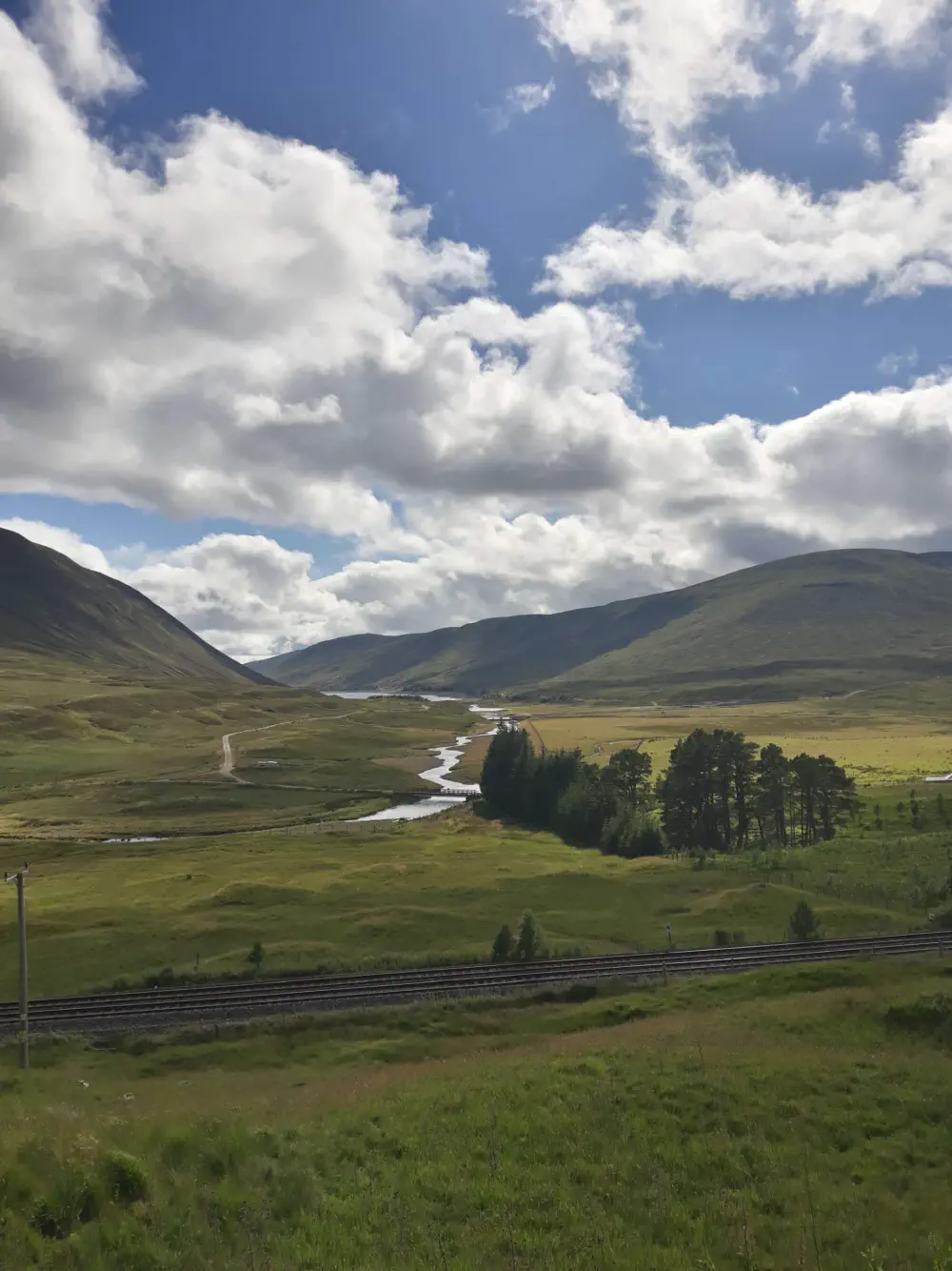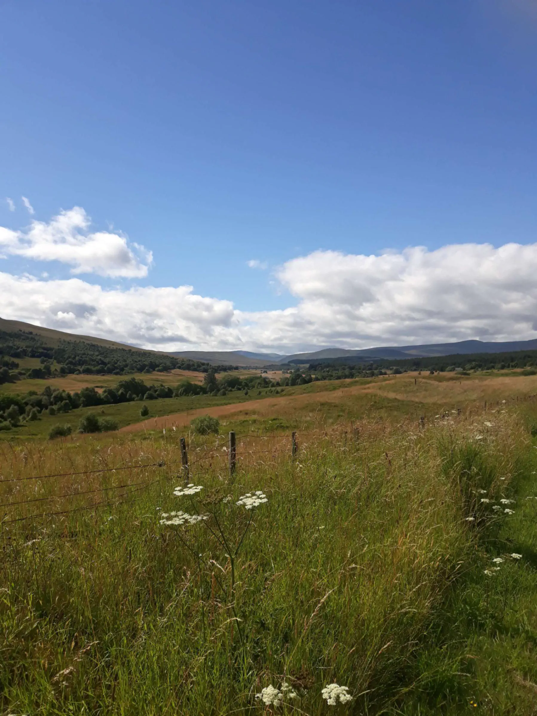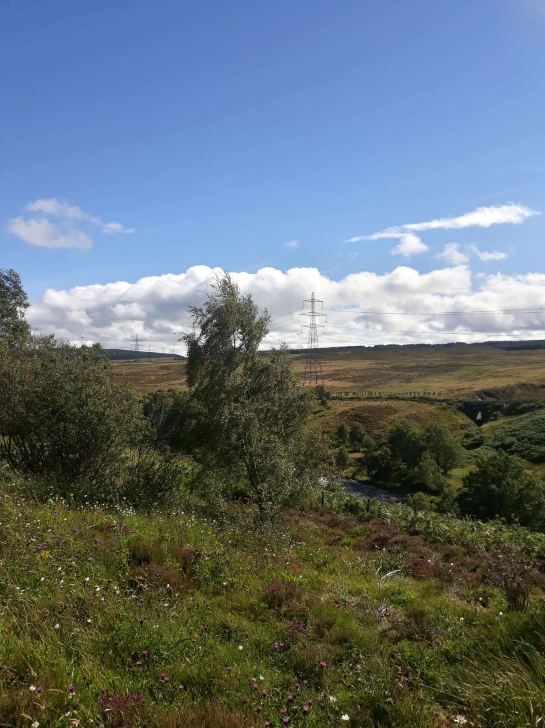 Et quel passage ! Sous un ciel magnifique - lumineux, mais chargé de gros nuages lourds - je passe enfin dans la partie sauvage de l’Écosse. Des collines à perte de vue, de grandes rivières grondantes, des parterres de fleurs à n’en plus finir.
