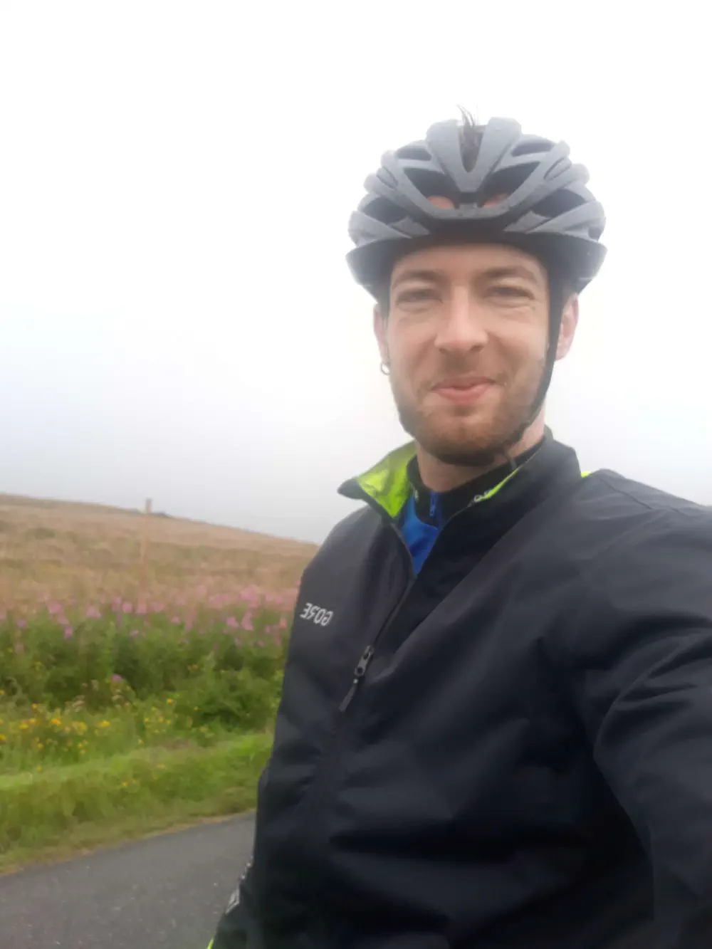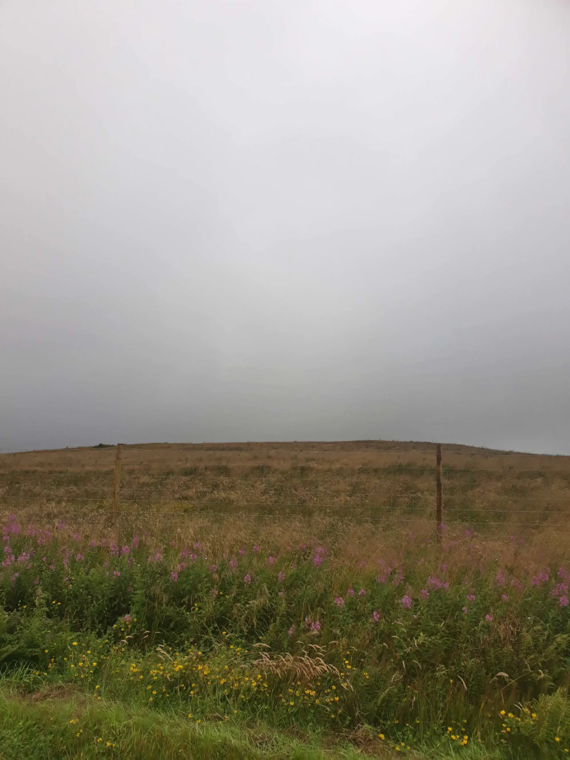 Une fois de plus je suis en combinaison intégrale et cette fois c’est nécessaire, je prends un torrent sur la tête. Malgré tout, je suis dans une forme éclatante, presque hilare. Il faut dire que les paysages noyés dans la brume sont magnifiques, j’aperçois au loin le bras de mer devant Édimbourg.