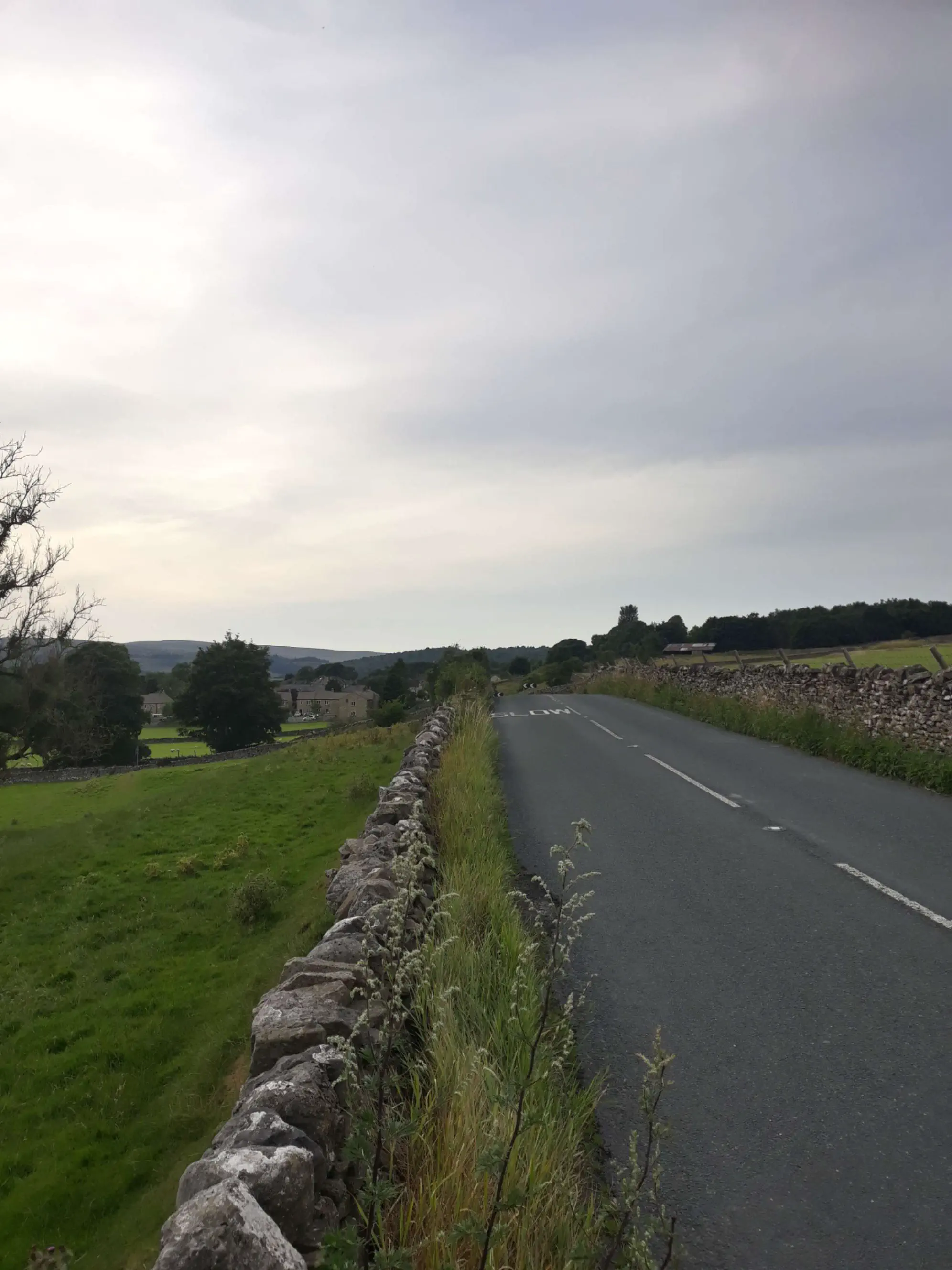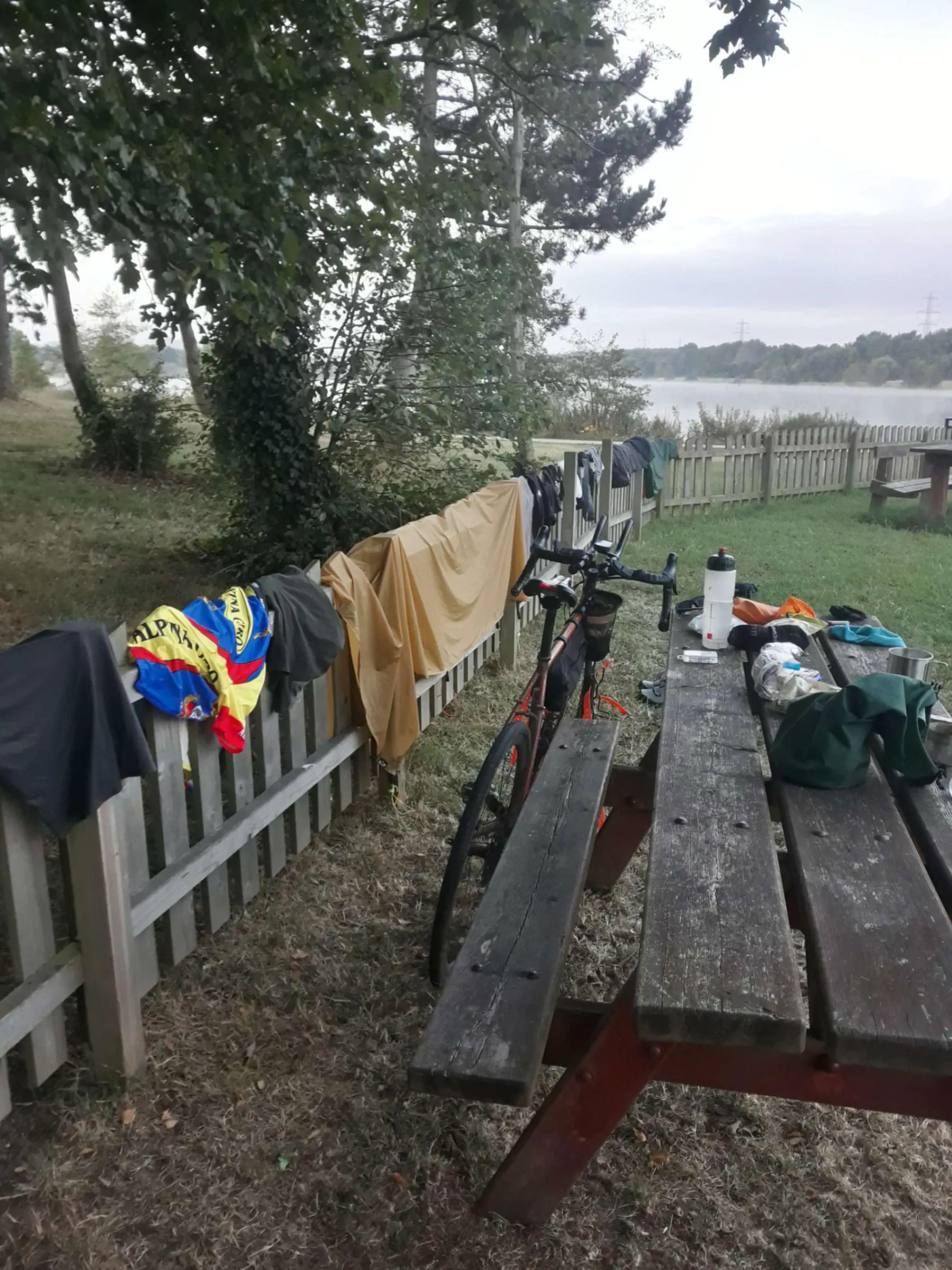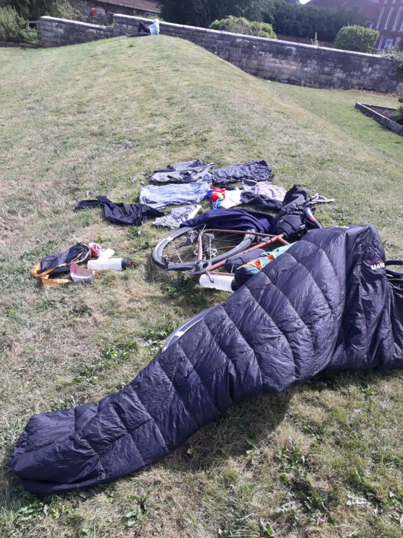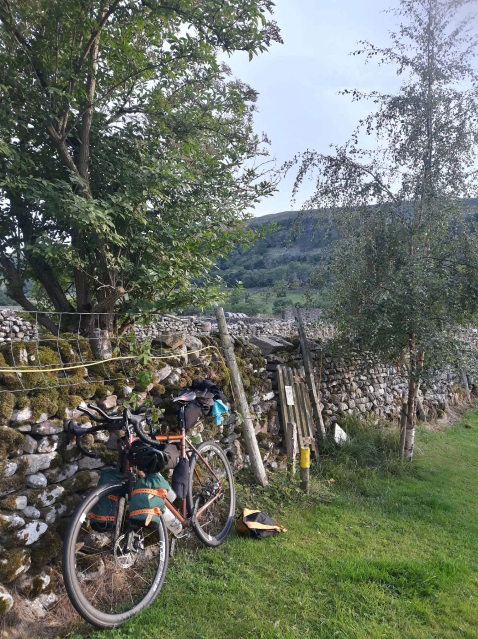 Je n’aime pas trop cette sensation au moment de me rhabiller puis de repartir. Les articulations craquent, on frissonne. Je prends le temps de préparer mon premier café du voyage, un plaisir simple et toujours renouvelé. Enfin, vers 7h c’est le départ. Il faut bien le dire : les 140 premiers km de la journée sont décevants. C’est très plat, je passe souvent pas des voies vertes qui m’obstruent la vue… pas terrible. Heureusement la météo, elle, est de la partie ! Pour la première fois, j’ai trop chaud et je peux retirer mes jambières et manchettes. Au détour d’une de mes nombreuse pause sandwich, je sors tout mon barda à l’air et en 20 minutes, tout est sec ! C’est un vrai soulagement car mon sac est en duvet et l’humidité viendrait sans problème à bout de ses capacités isolantes. Enfin, passée cette premier moitié de journée, me voilà, au détour d’une côte interminable à 16%, dans le Yorkshire ! Et voici enfin l’Angleterre que j’étais venu chercher qui se découvre. Des pâturages à perte le vue, le son des cloches, des collines bleues noyées dans la brume. La route est très dure, d’ailleurs il a beaucoup de cyclistes, parfois des pelotons. Mais chaque montée est la promesse d’un panorama toujours plus beau, à mesure que je me rapproche de la côte et du Lake District. Finalement, au kilomètre 193, j’aperçois du haut de la route où je suis perché, un minuscule camping “à la cool” dans la bourgade -au nom évocateur- de Kettelwell. Je ne résiste pas, même si physiquement je me sens encore très bien. Le bivouac c’est difficile malgré tout, vu l’effort fourni en journée. La perspective d’une bonne douche l’emporte. L’accueil est fermé quand j’arrive, sauf que cette fois, surprise, il y a un numéro et le patron que j’ai au bout du fil, m’indique que je pourrais laisser dix livres dans la boite aux lettres. Enfin un peu de simplicité ! (Et ce n’est pas très cher, pour un camping anglais). J’essayerais de rattraper le retard accumulé en prenant de petits raccourcis dans les jours à venir, histoire de tenir mon planning, qui est serré ! Demain s’annonce très dur. Un cycliste rencontré à Newport m’a prévenu : les pires dénivelés seront dans le Lake District, dit-il après avoir fait l’expérience de l’Écosse. Je vais donc devoir prendre mon courage à deux mains, car les jambes ont malgré tout souffert dans les cols aujourd’hui.