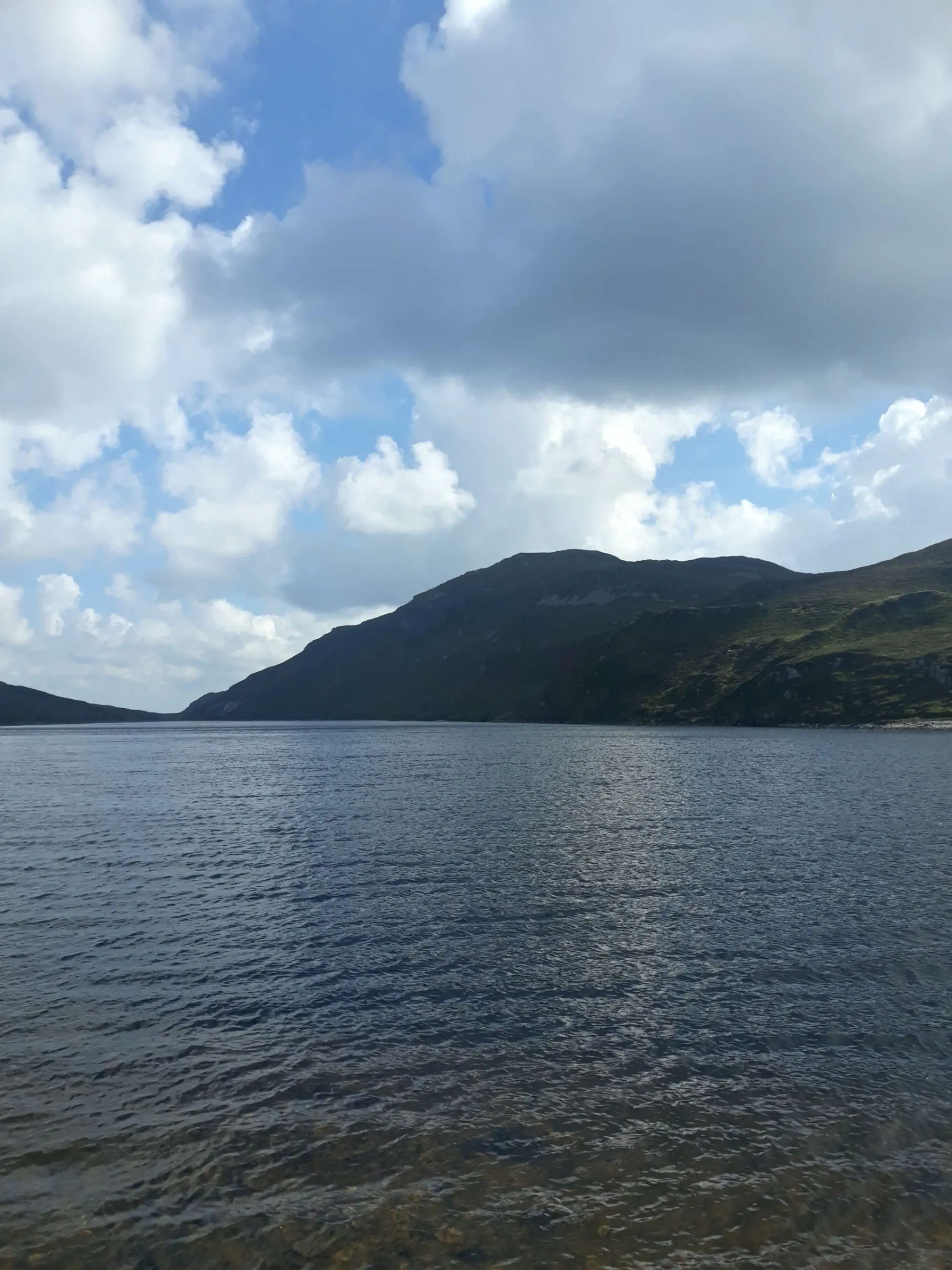 Je viens finalement à bout de cette montée, pour découvrir, enfin, un magnifique paysage. Le sommet de la montagne plonge dans un petit lac “d’altitude”, des moutons paissent tranquillement et la route redescend en décrivant de jolis lacets que je prends beaucoup de plaisir à dévaler.