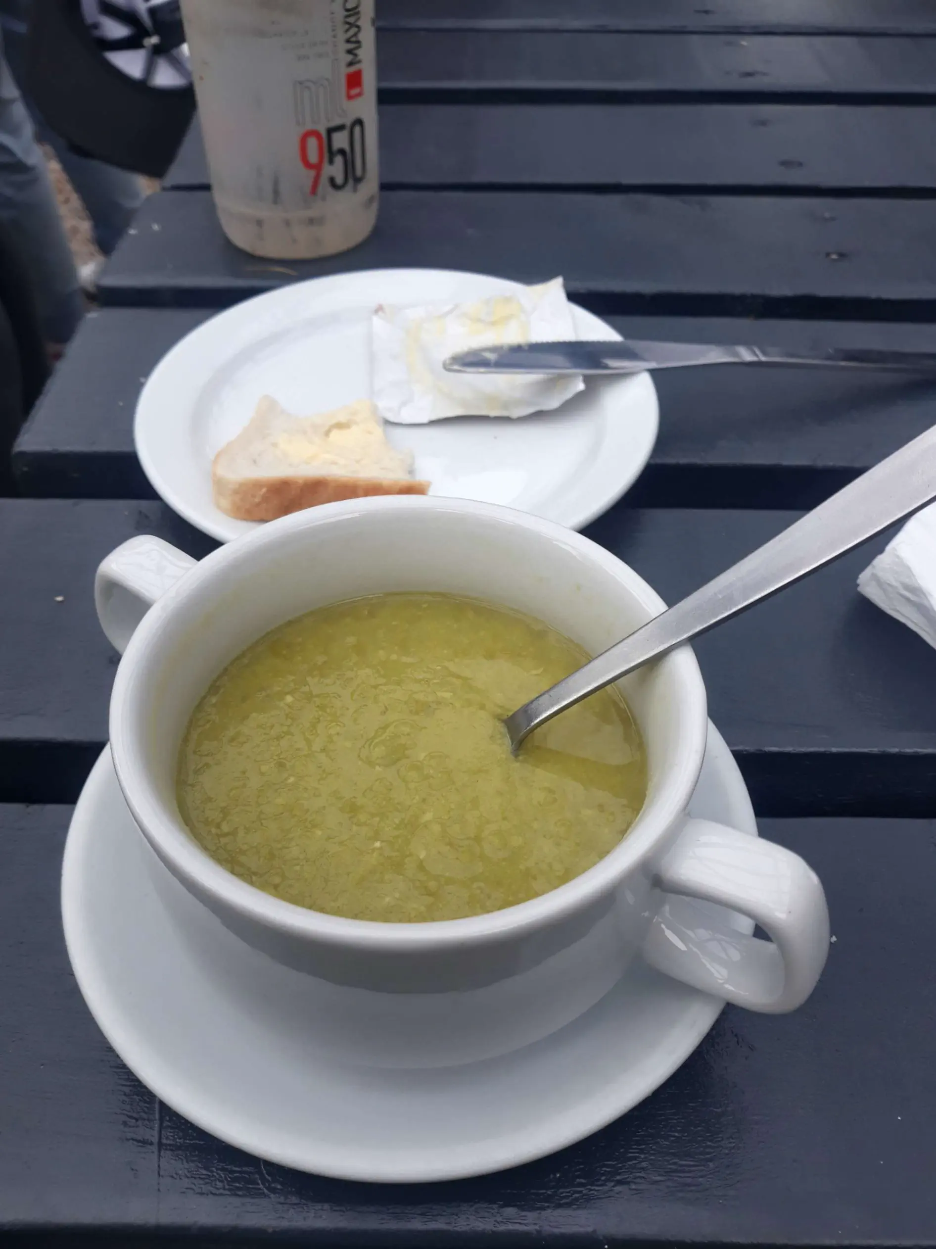 À midi, je fais de nouveau une pause dans un café, notamment pour me réchauffer, car je suis trempé jusqu’aux os. Une bonne soupe aux poireaux bien chaude puis un grand café (avec un flapjack, c’est une évidence) et je suis reparti.