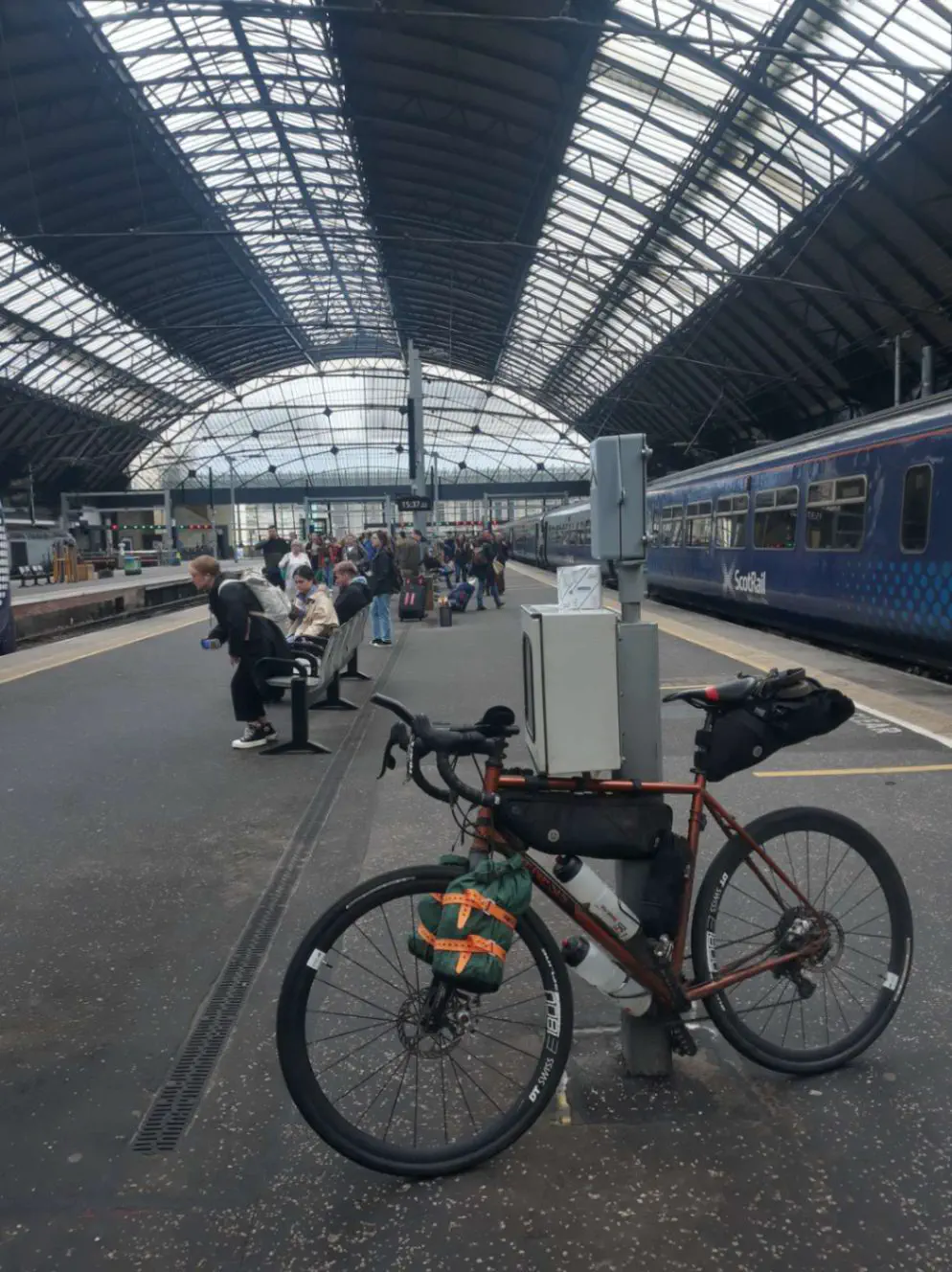 Une fois encore, pas le temps de traîner, je file à l’autre gare d’où part le deuxième train, je rachète à manger (car, oui, je consomme autant pendant mes jours de repos que de vélo), discute avec quelques autres passagers sympathiques et c’est parti pour un TER ambiance locale direction Ayr, au sud-ouest.